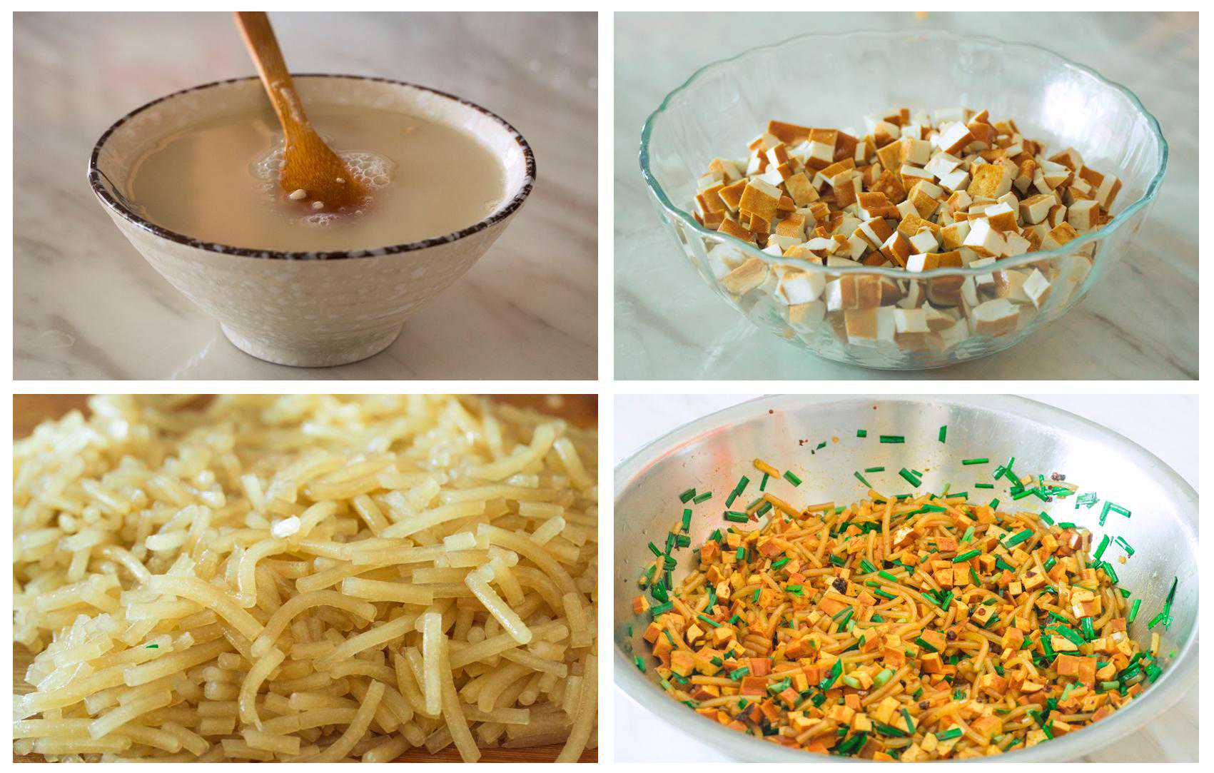 3、准备馅儿料,一把红薯粉,倒入开水泡软;