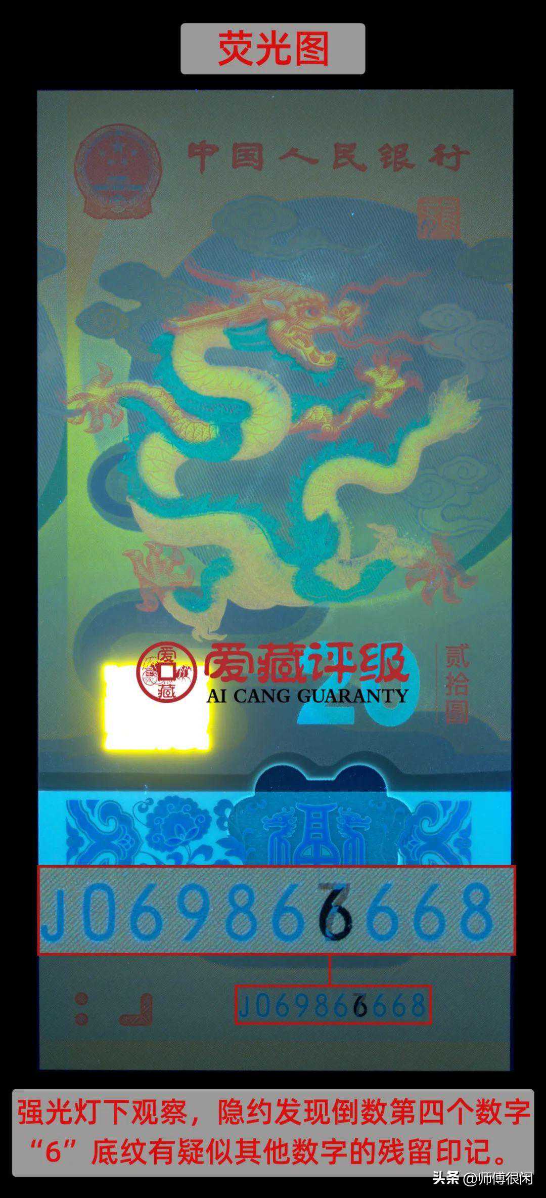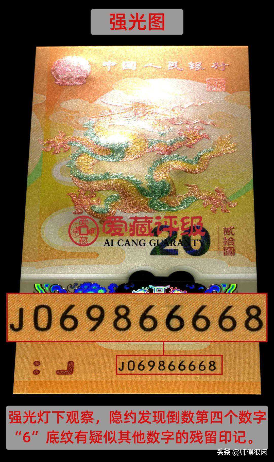 不过龙年纪念钞号码收藏也需要注意改号的情况出现,近日爱藏评级在评级过程中通过专业设备发现了一张龙年纪念钞改号的品种。这个也是到目前为止第一张出现改号的龙年纪念钞,这一张龙年纪念钞J069866668,圆圆倒置号尾8的品种,通过技术手段将数字7改成了6。