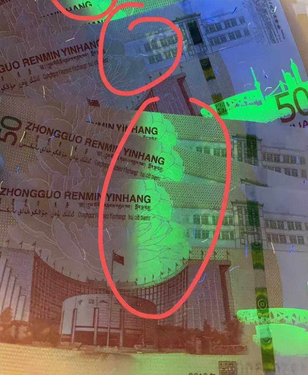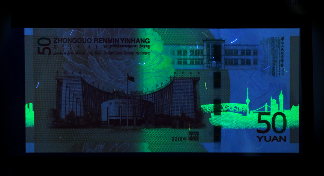 这是一种稀少的荧光版别。纸币中间在荧光灯之下,会呈现半朵绿色荧光牡丹,特别显眼。正常70钞是没有这种荧光的。