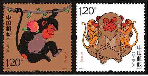 《丙申年》特种邮票一套二枚,图案内容分别为“灵猴献瑞”和“福寿双至”,每枚面值1.2元。第一幅“灵猴献瑞”图中,猴子的一只手放在树枝上,尾巴缠在桃树上,另一只手捧着桃子,意寓“捧桃献瑞”;第二幅“福寿双至”,图为一只母猴抱着二子,意寓“合家欢乐”。