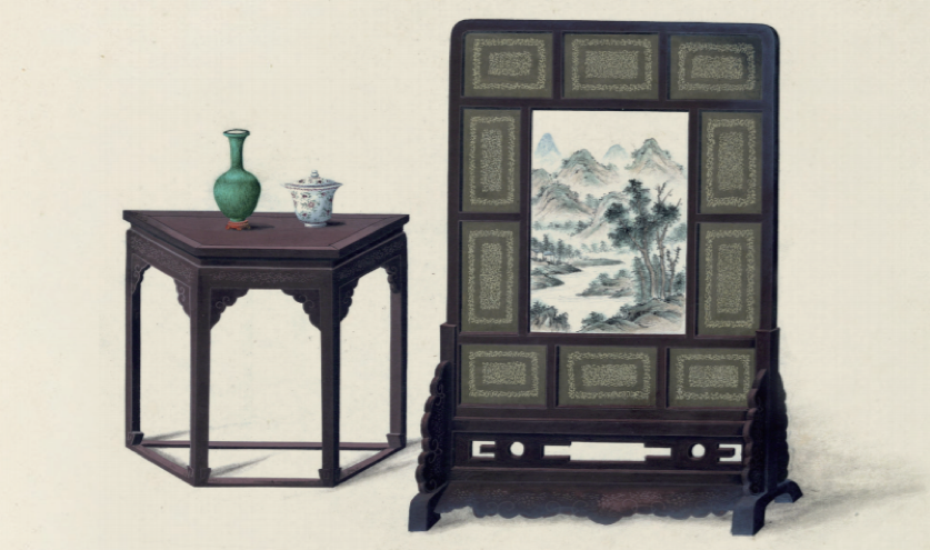 其中,由晚清中国外销画家发呱绘制的《家具陈设画册》,全套共四十六幅,内容主要为中式家具,如柜架、椅凳、桌案、床榻、轿子、灯笼及相关陈设摆件,如屏风、书箱、瓶座、碟架、瓷瓶、杯盘、文房器物等,每幅纸背有手写英文介绍。书前印有他的商标,写着“发呱,油画、水彩画和玻璃画家”——当时有不少广东外销画家被称为“某呱”。将画家称之为“画官”,是一种对职业的尊称,当时十三行的一些画家可能也确实有顶戴。
