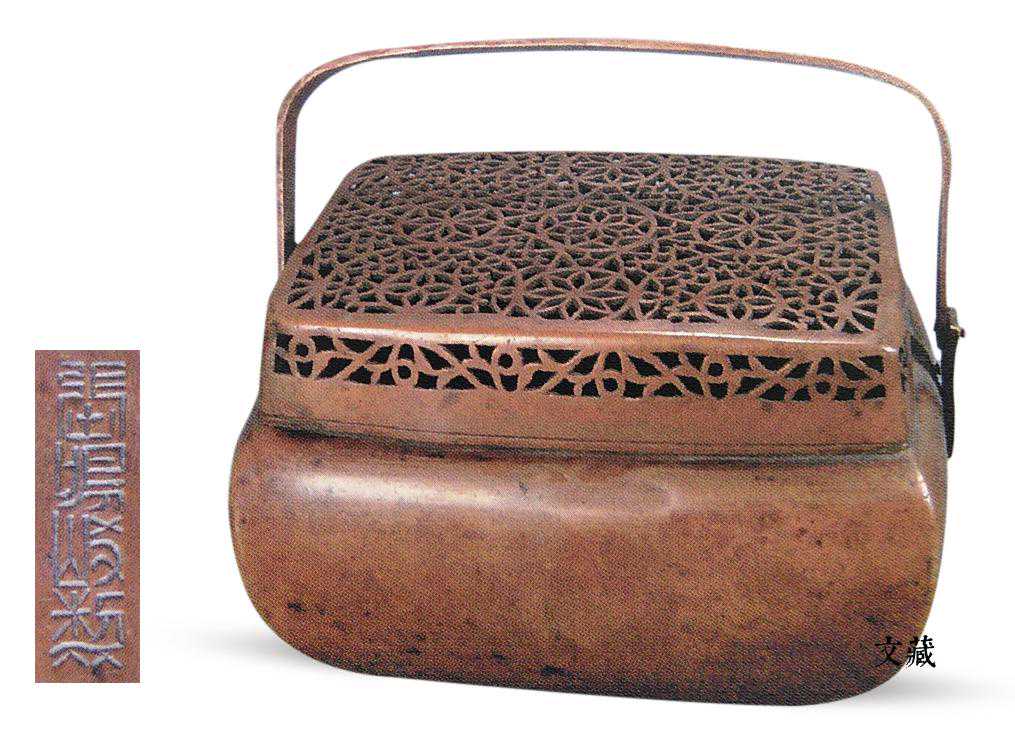 铜手炉由炉体、炉盖、提梁组成,有的无提梁。在炉体内放入燃着的木炭,盖上镂空的炉盖,热气从镂空的孔洞中冒出,即可暖手。手炉的器形丰富多彩,有圆形、椭圆形、正方形、长方形、六角形、八角形、瓜棱形、灯笼形、鱼蒌形等等。
