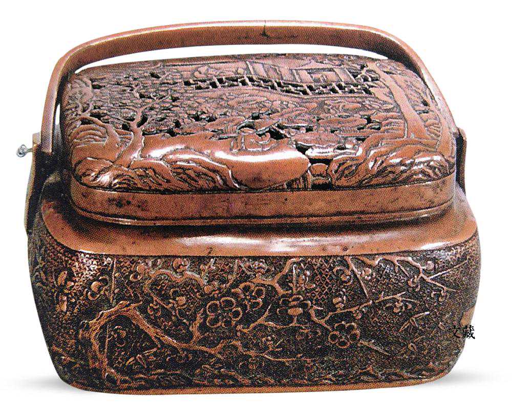 明末万历天启年间,在浙江嘉兴和上海淞江地区出现了以张呜歧、胡文明、王凤江为首的制炉名匠,将手炉的制作工艺发展到一个较高的水平。安徽省文物总店藏二件张鸣歧刻款铜手炉,一件胡文明刻款山水梅花铜手炉。
