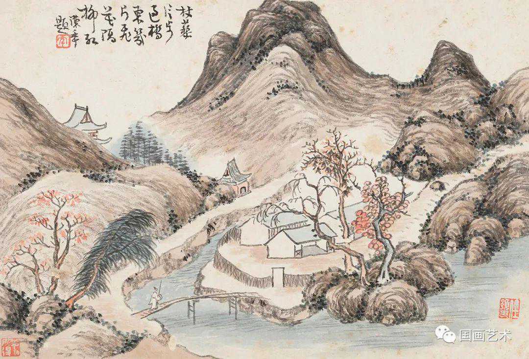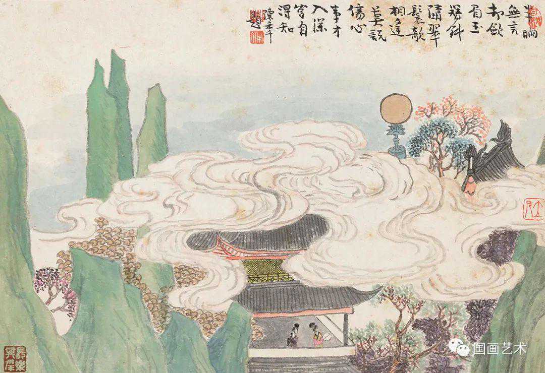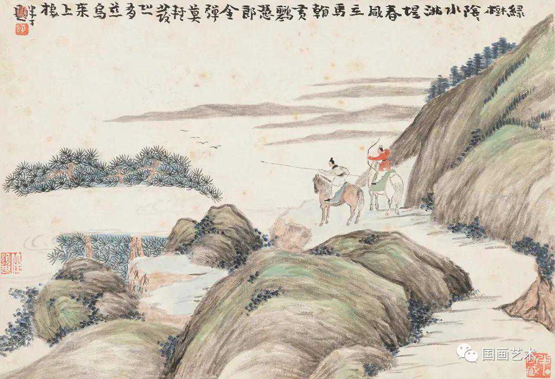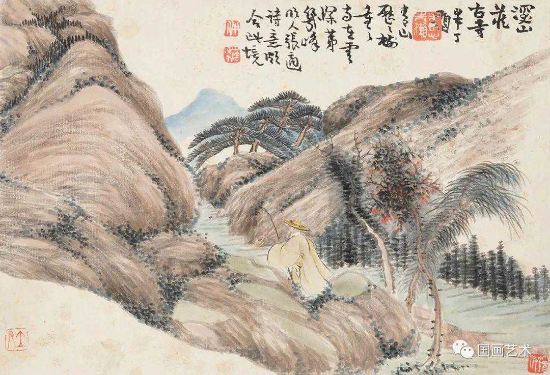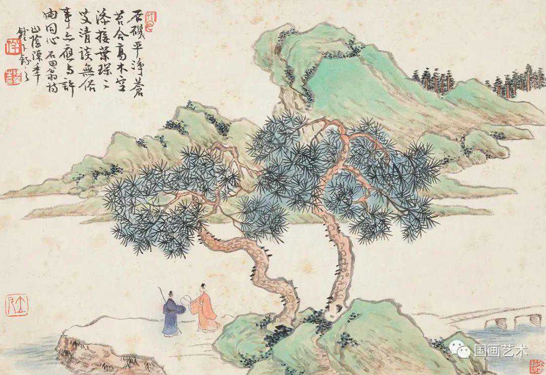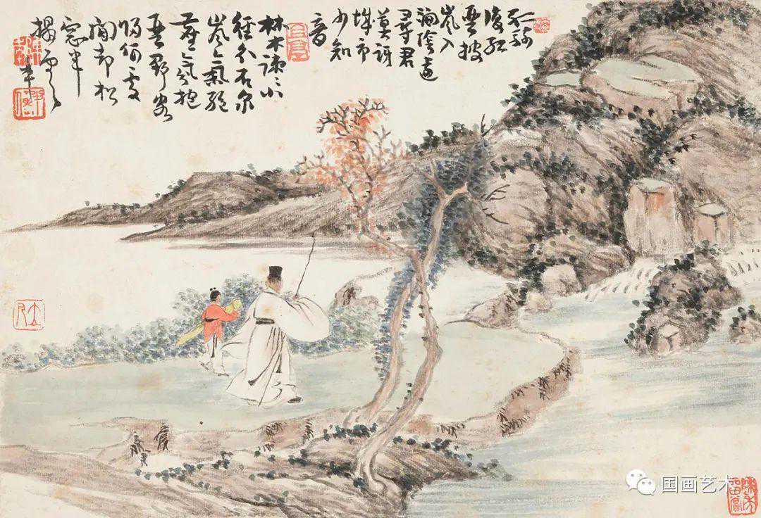 《前人诗意册》十二开,设色纸本,尺寸21×30.5cm,笔墨松秀,设色清丽,古朴雅致。
