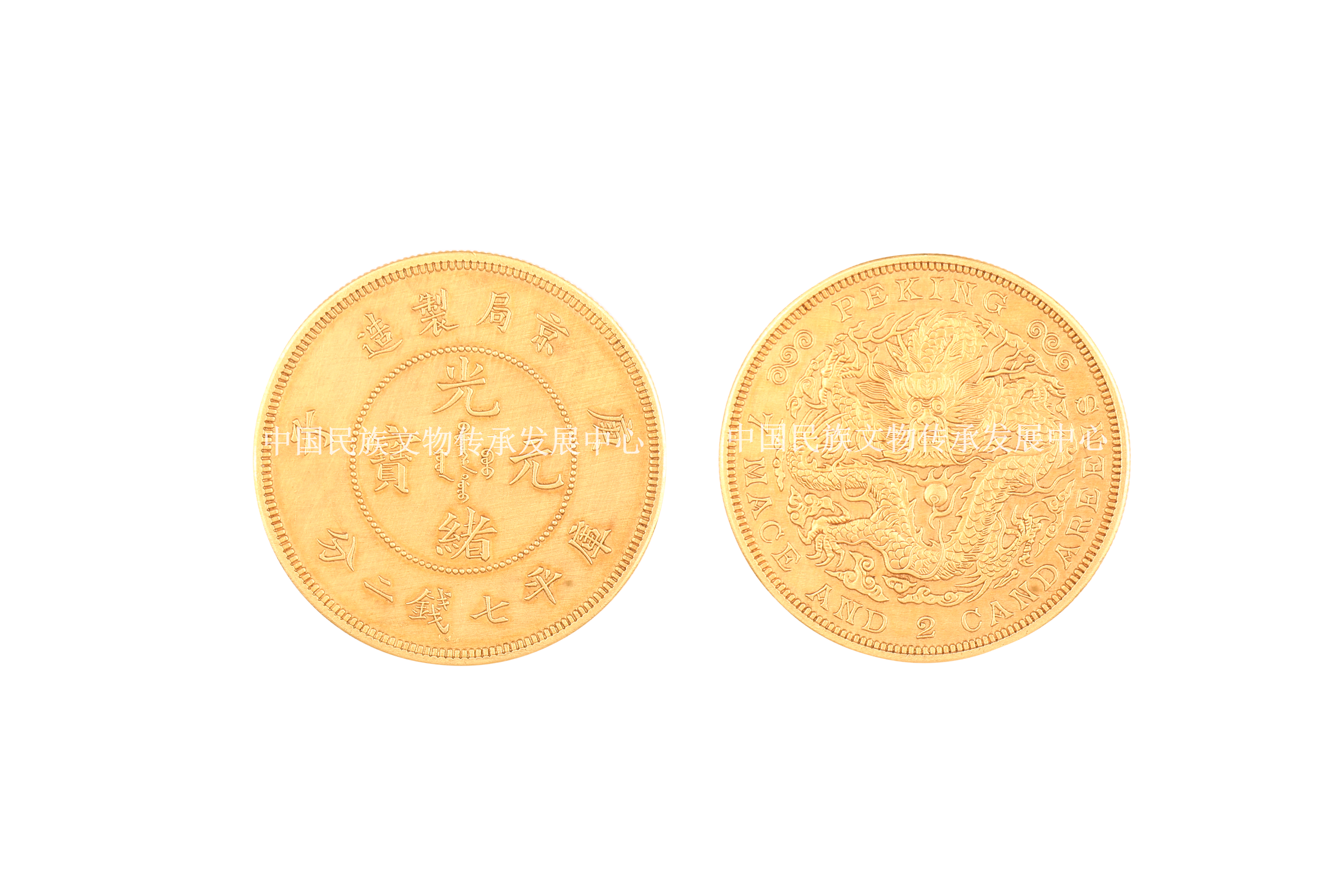 清代光绪二十六年岁次庚子(1900年)清政府北京银圆局成立开始铸造金币,当时委由英国皇家铸币厂雕制铸币钢模,币面图样正中光绪元宝满、汉文四字,左右年份"庚子"上端为铸造机关"京局制造"四字,下端计重正面印有“七钱二分”,背面图样中为一大清龙图,上、下端分别为英文"PEKING"和重量。