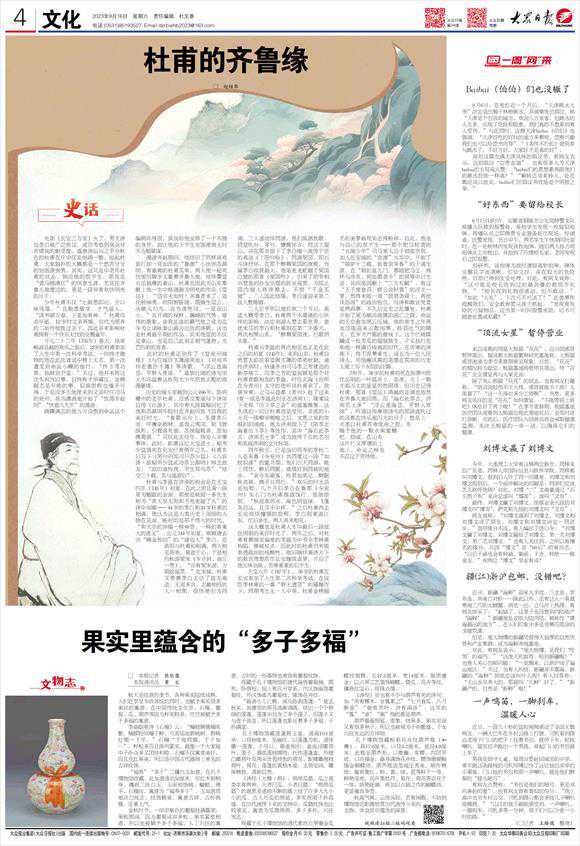 《诗经》里也有不少与葫芦有关的诗句。如“南有樛木,甘瓠累之”“七月食瓜,八月断壶”“匏有苦叶,济有深涉”。这里的“瓠”“壶”“匏”指的都是葫芦。
