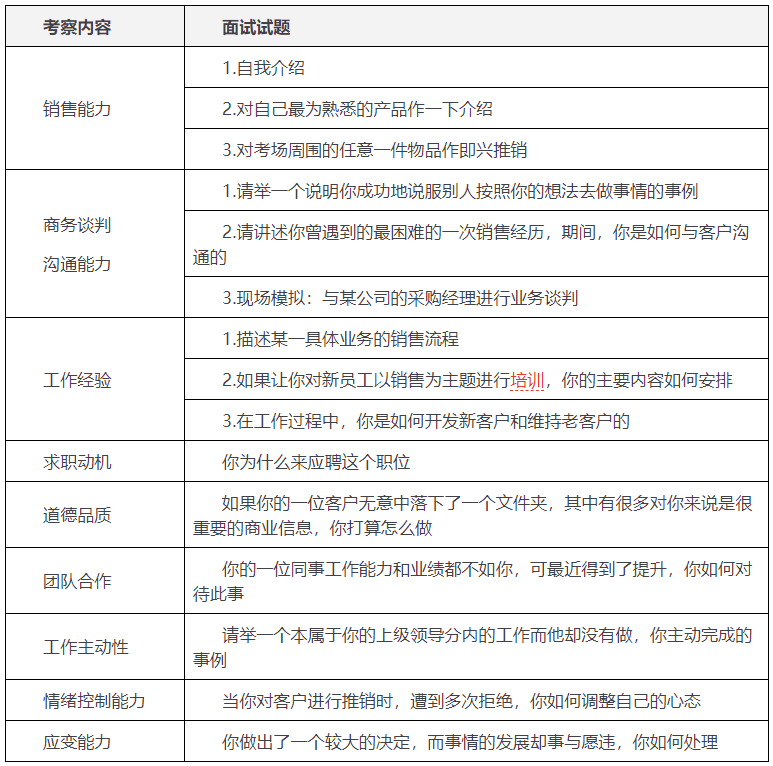 销售人员须具备较强的客户服务意识、灵活的沟通技巧、较强的销售能力和工作积极主动等素质,下面列举的这些面试问题可以用于测试销售人员的这些能力。