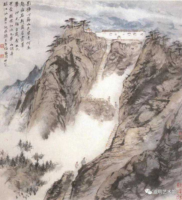 裴家同先生平生坚持笔墨精进,“以技进道”,至晚年渐进变法,不断拓新笔墨语言形式,逐渐突破传统山水画图式,终创山水画大美与内美相融合的境界。巨幅作品《江山如此多娇》(365×145cm)创作于2009年,此时作者已年迈81,这是他重要代表作之一。这幅作品吸收了新安画派、黄山画派的某些因素,善用笔墨,借景抒情,表达画家游历沉潜山水的感悟、心灵的逸气及个人的品格气节。此作构图雄伟,气势如虹,山峦起伏,瀑流垂蜿,云气索绕,景致幽深,气象万千,意境奇崛;此作总体上气势磅礴、博大雄强,但局部又景象丰富、姿彩纷呈、灵秀鲜活,可谓“真山水之川谷,远望之以取其势,近看之以取其质”(郭熙《林泉高致·山水训》)。这是将南派山水的秀丽滋润与北派山水的雄强壮美合二为一,山水图式别具一格,笔墨语言个性突出的典范作品。《九华天台胜境图》《双岭峰》《霞光高千尺》《九老观瀑图》《观瀑图》等作品,都是南派之秀丽与北派之壮美相融合,山水图式新颖而别致,笔墨语言丰富而精到,情感抒发率意而畅快,表现“浩气唤诗魂”“大地任纵横”(元末王廷圭《登临岳西白云寨》诗句)而追寻山水大美内美极致境界。正是以《江山如此多娇》《天柱览胜图》《黄岳胜境图》等一批代表作品,从绘画图式到笔墨语言到审美意境,在一定程度上突破了传统山水画表现程式,大大拓展了现代山水画艺术空间,以大美境界与内美意蕴而别具个性风采,独树一帜,不同流俗。
