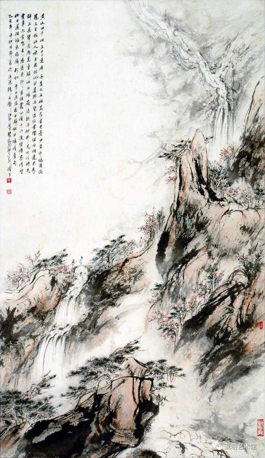 然而,裴家同对傅抱石并非亦步亦趋,他师法传承了前贤,又突破超越了前贤。这种突破超越主要表现在:其一,在傅抱石那里,破笔散锋的“抱石皴”主要用于表现山石的结构、特质和意趣,而在裴家同作品中,“抱石皴”及其破笔散锋,除了用于表现山石,还广泛用于表现虬松、林木、云水等,进而拓展了“抱石皴”这一技法,形成了特有的“家同皴”。“这种笔法以气取胜,磅礴多姿,自然天成,也成为了裴氏山水的独特面貌和个性符号。”(范迪安《裴家同山水画作品赏读》)《峡江秋蔼图》《烟江叠嶂图》《吴休先生重游黄山诗意》《黄山四千仞》《九华纪游》《老骨迎秋》《瀑布小更奇》《越涧悬崖何时来风雨》等作品便是普遍证明。其二,在傅抱石那里,勾画山峦峰岳岩石的轮廓多用中锋线条,少用破锋笔线,而在裴家同作品中,常以破锋笔线勾勒山石物象轮廓,笔墨线条更加丰富、更为率性,尤其是破锋长线的驰骋纵横更加衬显“家同皴”之乱而不乱、奇肆多姿。裴家同的《桂林叠彩胜境图》《坐山石以忘归》《天柱山小景》《岩壑幽居图》等作品堪称其典型代表。其三,傅抱石传承弘扬了石涛画风的豪放肆恣、酣畅淋漓,笔墨变化丰富,不可端倪,具得自然真趣,一派勃然天机;裴家同则着力将石涛的豪放肆恣和石溪的苍茫浑厚、梅清的磅礴奇崛融会贯通,择善而从,笔墨率性随意,不拘成规,颇得山水灵性,一派鲜活气息。因此,裴家同的诸多作品如《松石清泉图》《黄山胜景图》《白云松青鸟声微》《山水四条屏》等呈现出别样的苍浑、奇崛而又清逸、鲜活的气象意趣,与他的老师傅抱石拉开了一定的艺术距离。
