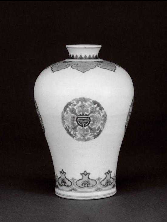 拍品与故宫博物院藏品品种相同,纹饰和清代官窑习见的满密布局不同,反其道而行之,将描绘主题纹饰的腹壁大面积留白,颇为独特。另见有英国铁路基金会旧藏清雍正斗彩团花寿字梅瓶,与拍品纹饰、风格类似,同属皇帝寿诞用瓷,应有传承关系。