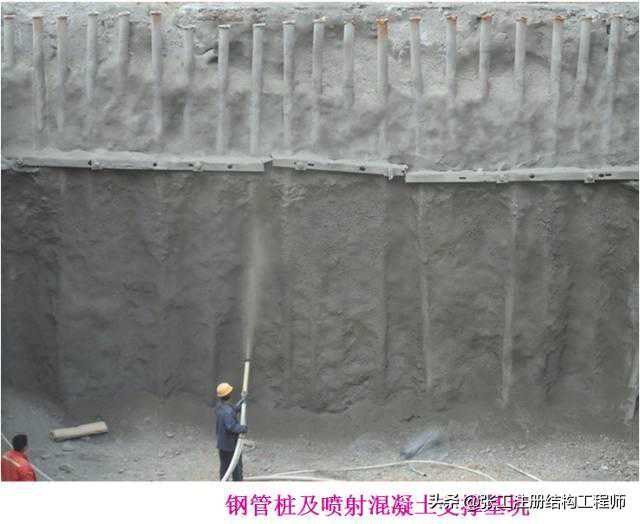 喷射混凝土及锚杆支护1)当基坑受条件的限制,开挖深度大,只能垂直或大坡度开挖,在地基土质较好、渗水量较小的情况下,可用喷射混凝土或锚杆(锚索)挂网喷射混凝土加固基坑坑壁,逐层开挖,逐层加固。2)当基坑为不稳定的强风化岩质地基或淤泥质粘土时,可用锚杆挂网喷射混凝土护坡。基坑开挖深度小于10m的较完整风化基岩,可直接喷射素混凝土。