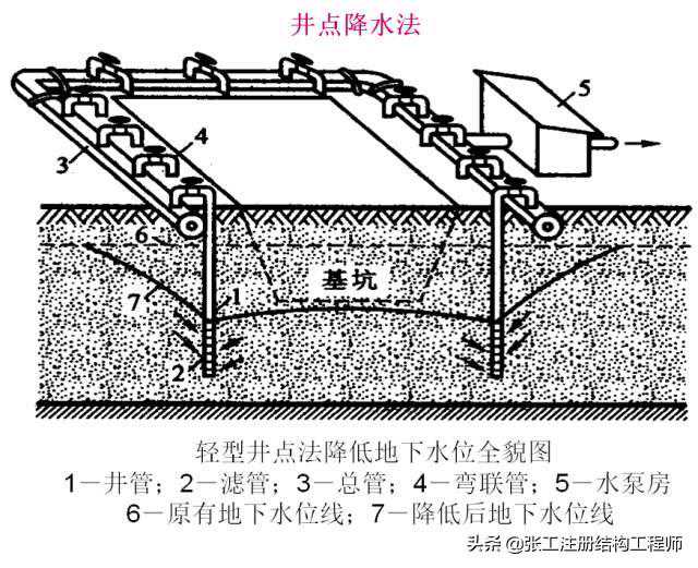 ②井管的成孔可根据土质分别用射水成孔、冲击钻机、旋转钻机及水压钻探机成孔。井点降水曲线至少应深于基底设计标高0.5m。