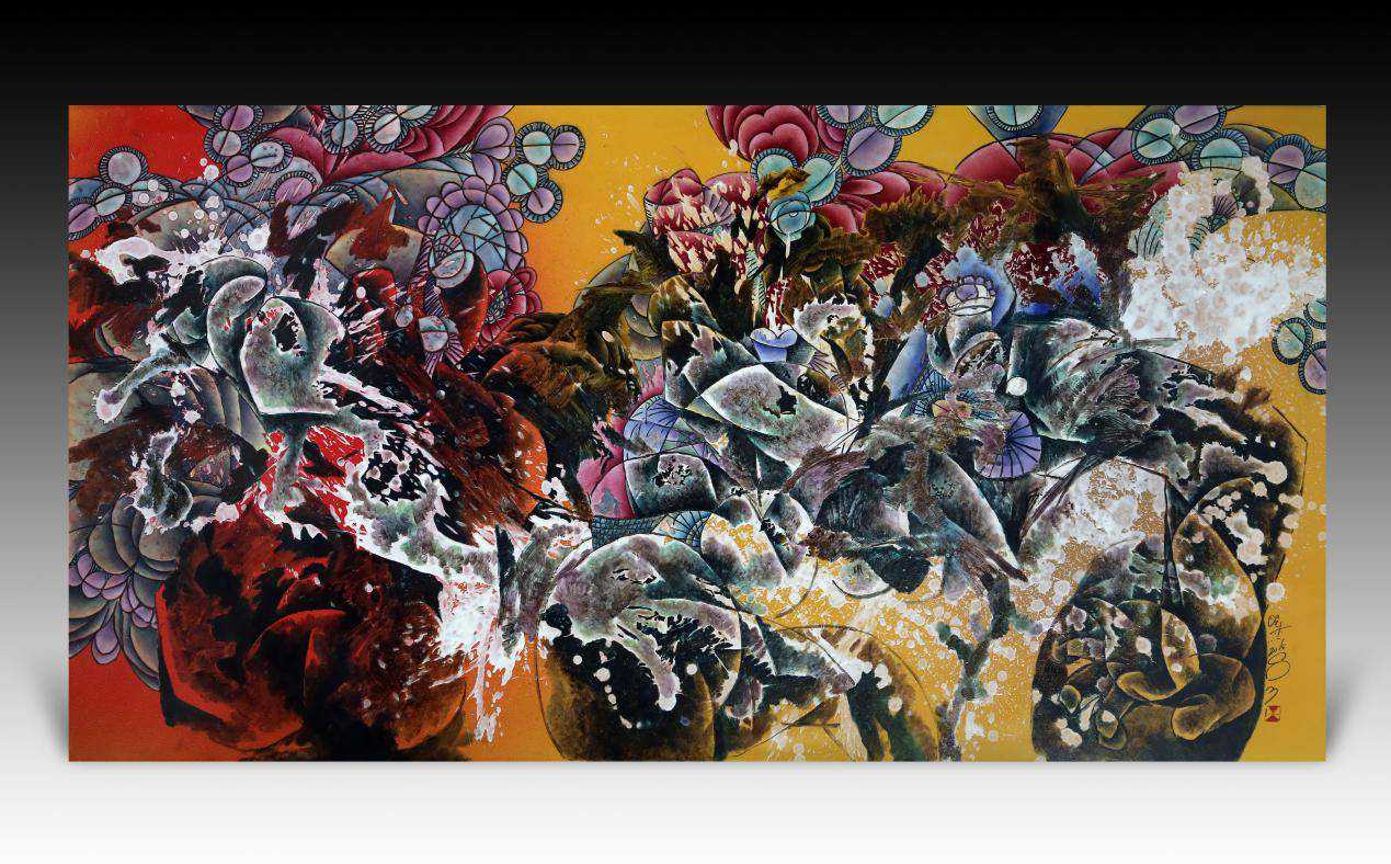 另外,他在创作中也尝试运用粉彩新工艺的方法,目的是丰富作品的色彩并增加清亮的光泽。创作中他特别注重大色块的安排,通过主、从、先、后的色彩层次之分昭示出作品内容的主、次、强、弱地位,力求在统一中求变化,在对立中求统一。无论是辽远的天空、斑驳的生命化石、或者是飘浮的年轮,均呈现出不相同的颜色,而包括玻璃白的裂变、凹凸、色彩三者合一带来的肌理效果则冀希望产生一种艺术性、唯一性的语言,进而产生一种强烈的艺术视觉穿透力,而笔墨与玻璃白的结合则是通过粗犷与细腻、轻盈与厚重、透亮与深沉的对比形成强大的视觉张力和独特的个性色彩。通过釉层的厚薄对比、冷暖色彩变化及形式上的疏密与深浅对比,不但创造出朦胧、淡泊、幽远、空灵甚至是虚幻的抽象艺术意境,同时还通过多维的艺术表达、空间的建立来阐释自己作品的抽象内在与审美主体之间的相互依存及相互映照的辩证关系。其内容之丰富,其思想之深邃,其色彩之炫酷,其技艺之娴熟,仿佛是作者用自己的美学观念和所有的观赏者在做一次跨时空的心灵对话,令人记忆深刻且过目不忘。这就是艺术的魅力!