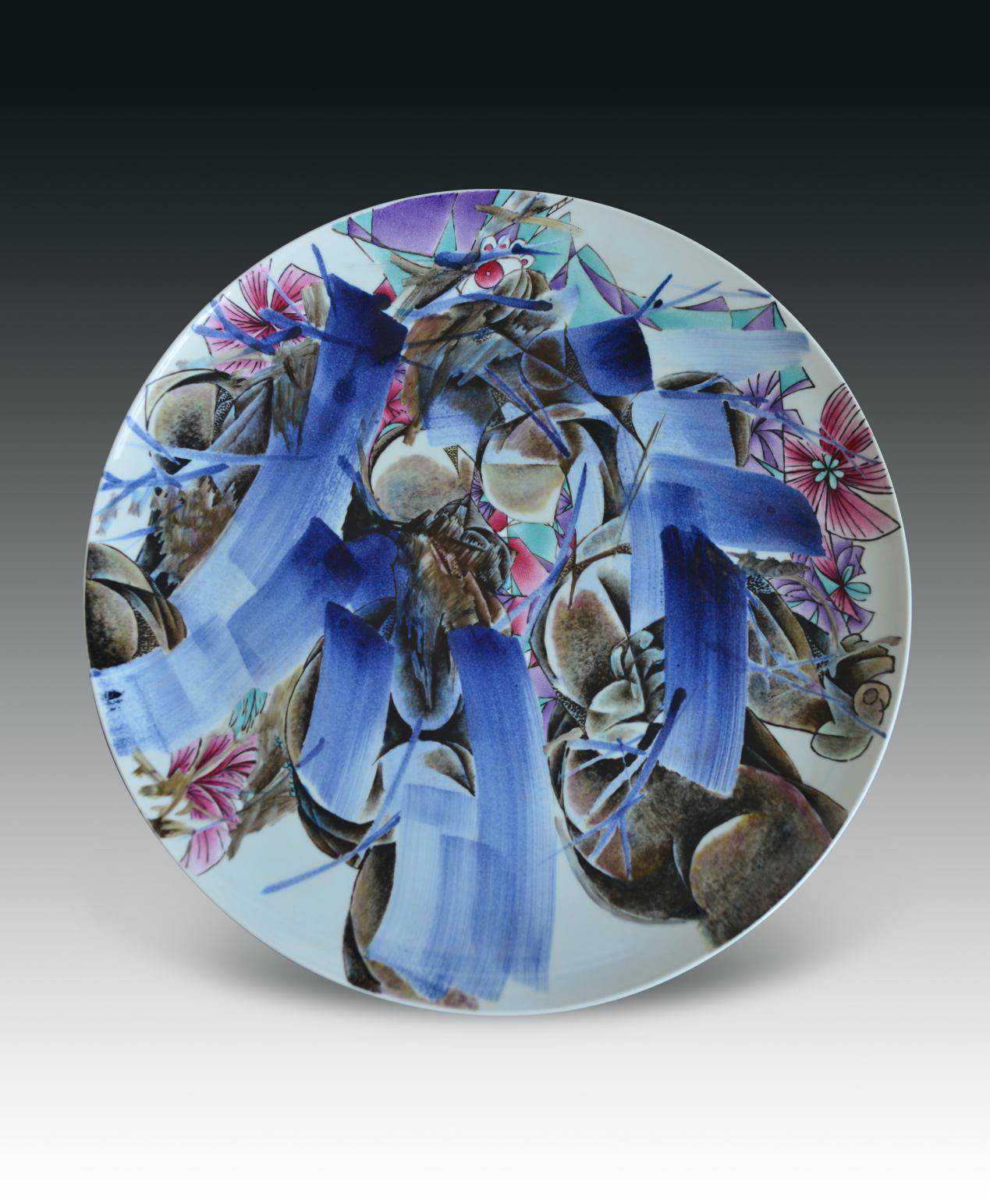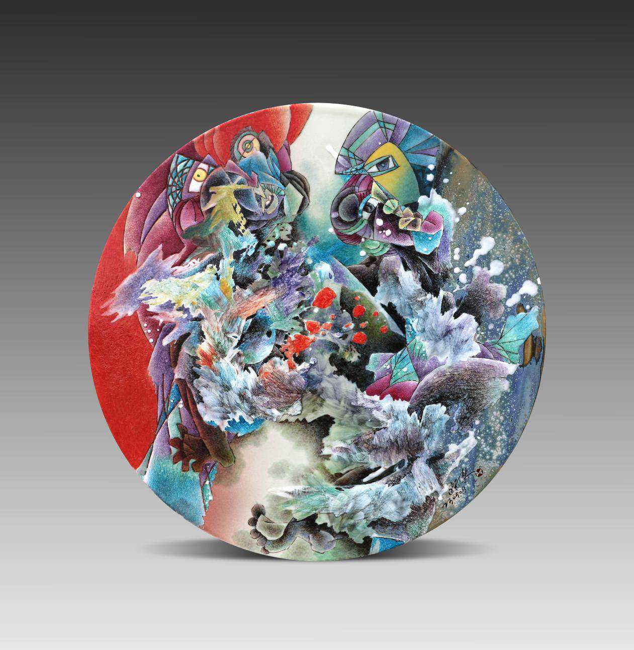在我心灰意懒之际,突然有个人的作品让我震惊,色彩鲜艳且斑斓,构图奇特而极富美感,既有现代表现形式又有传统技艺,充满了随性设计和反叛精神,有自己独特的艺术语言和思想表达。留给我的第一印象:这个人是个旷世奇才,是一个划时代的杰出人物,具有唯一性和不可替代性,称之为景德镇陶瓷绘画界横空出世的毕加索与独有的艺术现象也毫不为过,这个人就是张晓杰!