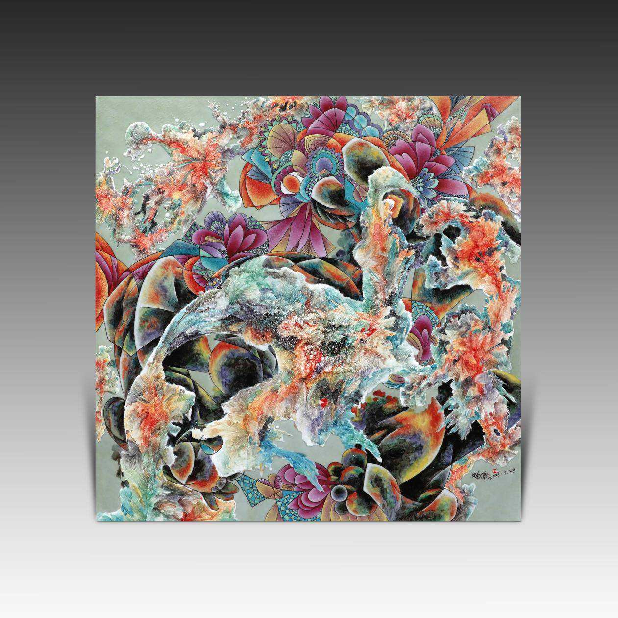 先来观赏晓杰新作《色彩与肌理》粉彩瓷板画。画面充满了艺术的虚幻和抽象的真实,完成这种构造需要创造性的想象能力并在自己的意识中构成新的意象,需要将记忆中储存的表象做创造性的分解组合创造出新颖、独特、奇特的意象,而意象又是反映抽象世界的最佳形式,作为一种符号,意象和其他任何符号一样在认识过程中是实在的对象、过程和现象的借代并成为存在与抽象之标示客体意之内涵即为“写”。通过“写”彰显其作品的精神风骨、立意气格而“象”则成为成为表意的手段并进而提炼出“意”。