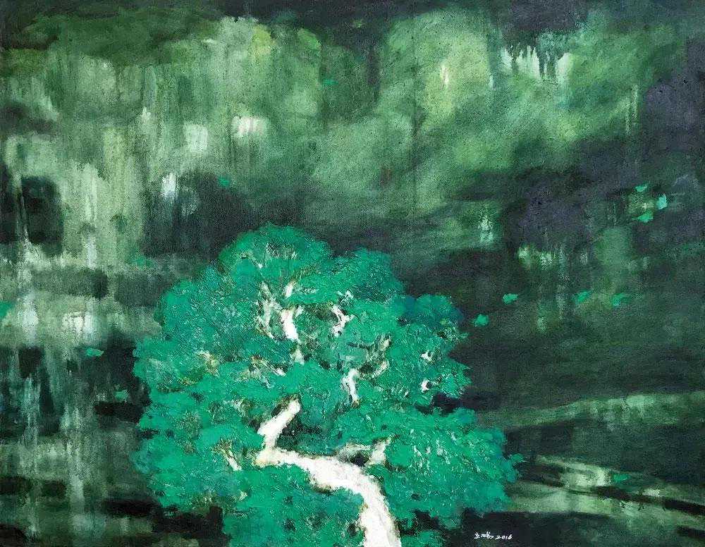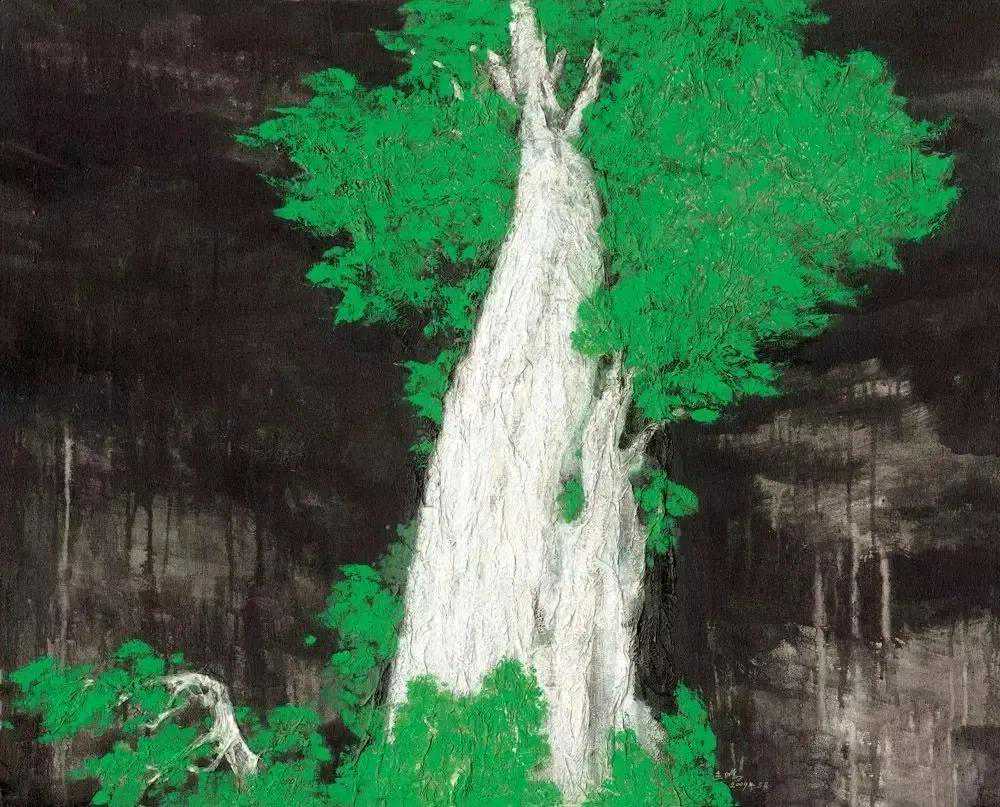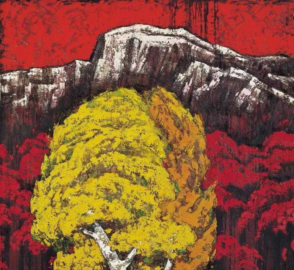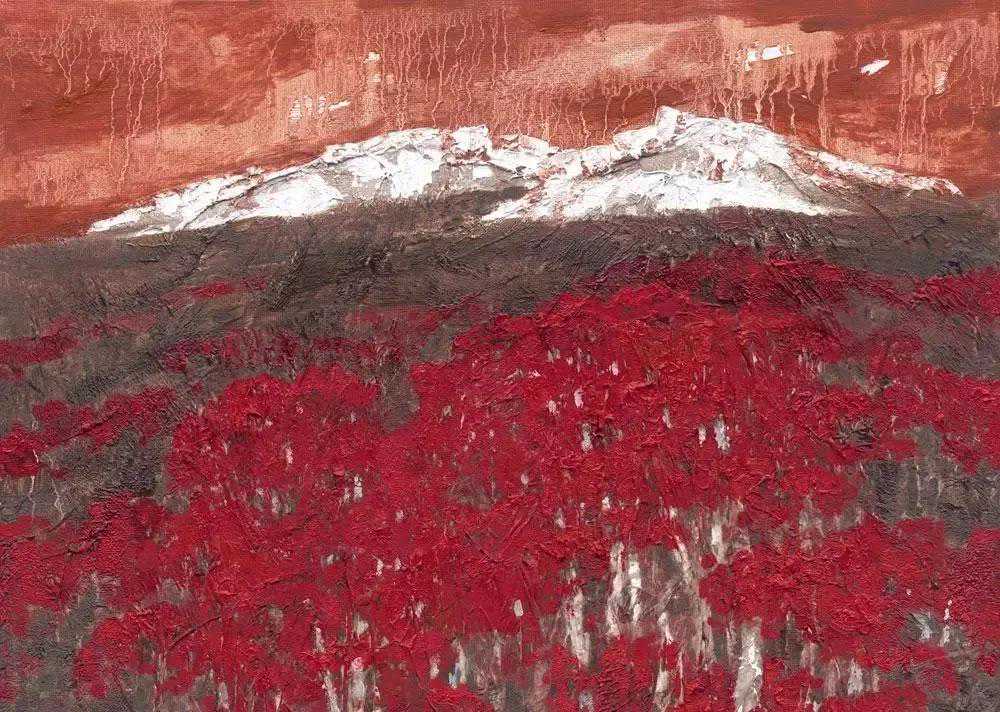 放眼当今画坛,闻先生无疑是具有鲜明个性的,尤其是他由红烛精神发展出的红色更是他的鲜明风格。他的画中如铁铸的造型与线条充满了力量感,那些遒劲有力的松柏便是国之脊梁,那如鲜血的红便是父辈的革命精神。