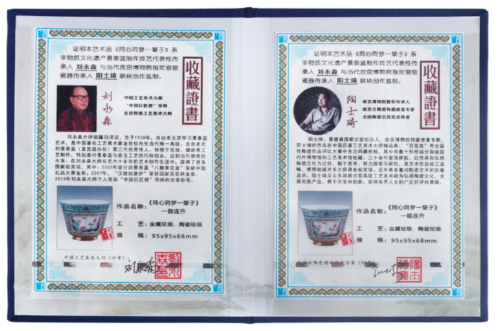 更附有两位大师签名的收藏证书和景泰蓝统一专用收藏票,正品防伪,珍藏价值颇高。