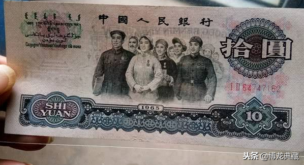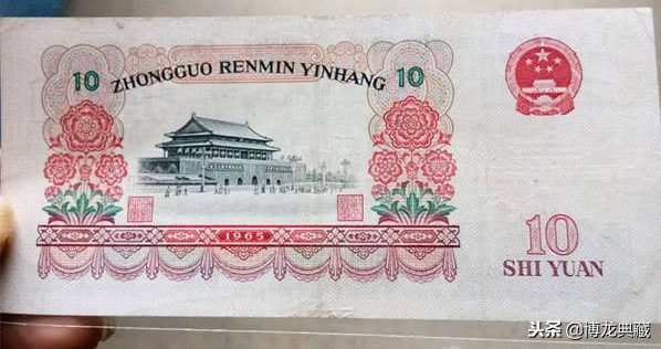1965年10元人民币票面上印制的是人民代表走出人民大会堂时的情形,表达人民当家做主,各族人民大团结的社会状态。那时候你若得着一张这样的纸币,总会情不自禁地数票面上有多少人,研究那些服饰是属于哪个民族。