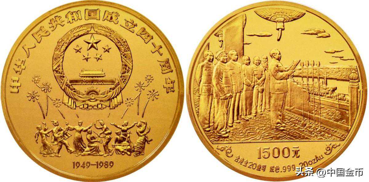中华人民共和国成立40周年金银纪念币一套四枚,其中20盎司金币正面图案展示了全民族欢度国庆的热烈场面,背面图案取材自巨幅油画《开国大典》,这幅画由董希文创作,被誉为“共和国成立的艺术见证”。