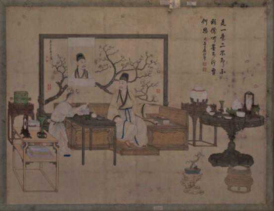 在宫廷画师为乾隆皇帝绘制的《是一是二》图中,弘历作文士打扮。端坐茶舍之内,手持书卷,目视清茶,身边放置着上古玉璧、商周青铜器、青花瓷器、善本书画等古物珍玩。