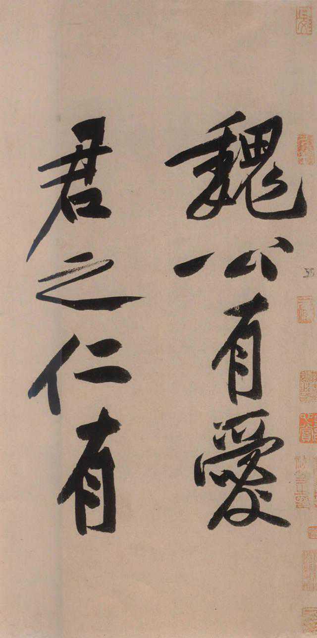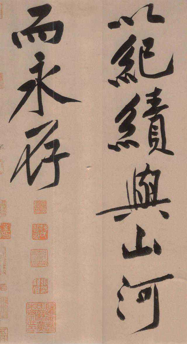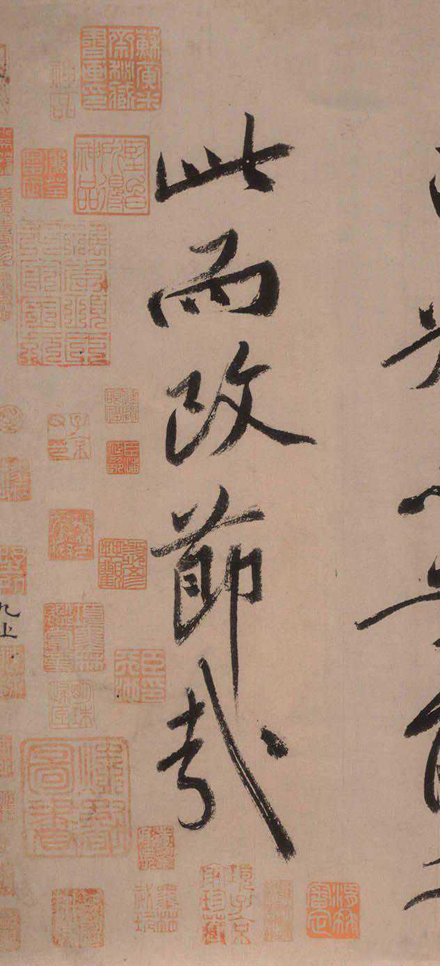 黄庭坚《砥柱铭卷》北宋传世墨迹,纸本行楷,共六百余字,抄录唐代魏征《砥柱铭》。卷上无年款,卷高32厘米,长824厘米,加上拖尾纸上历代名家题跋,共卷长近15米。仅次于现藏于美国的18.22米草书《廉颇蔺相如列传》卷和藏于台北故宫的10米长大行楷《明瓒诗卷后跋》,比著名的《伏波帖》(8.20米)、《诸上座帖》(7.29米)还长。