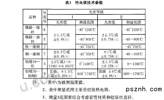 以上详细介绍了工业测量中常用几种热电偶的性能,实际使用中用户还有其它不同分度号的热电偶可选择,如表3所示,统计了热电偶的相关技术参数,供大家选型时参考。