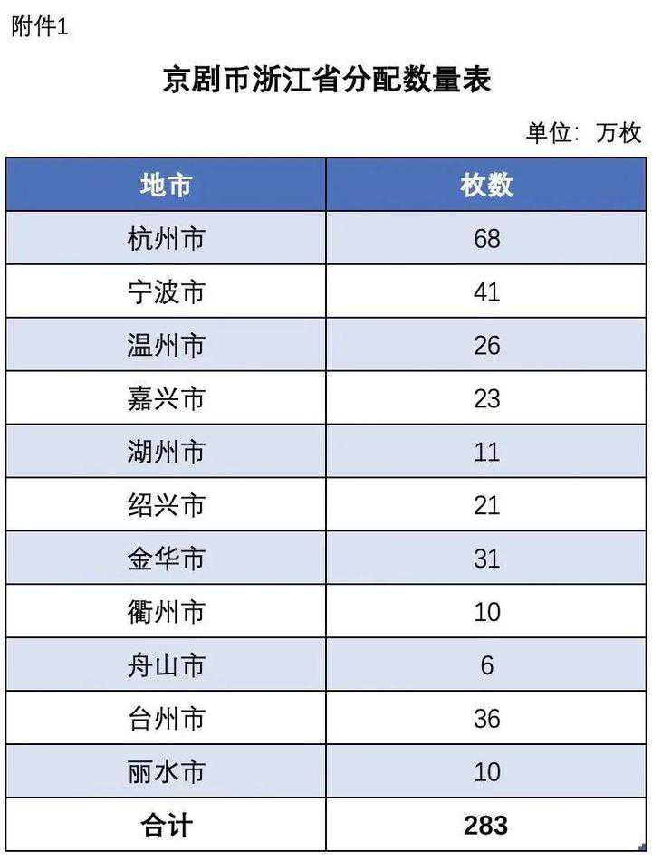浙江省内纪念币的发行数量为283万枚,其中,杭州市发行量最大,为68万枚。
