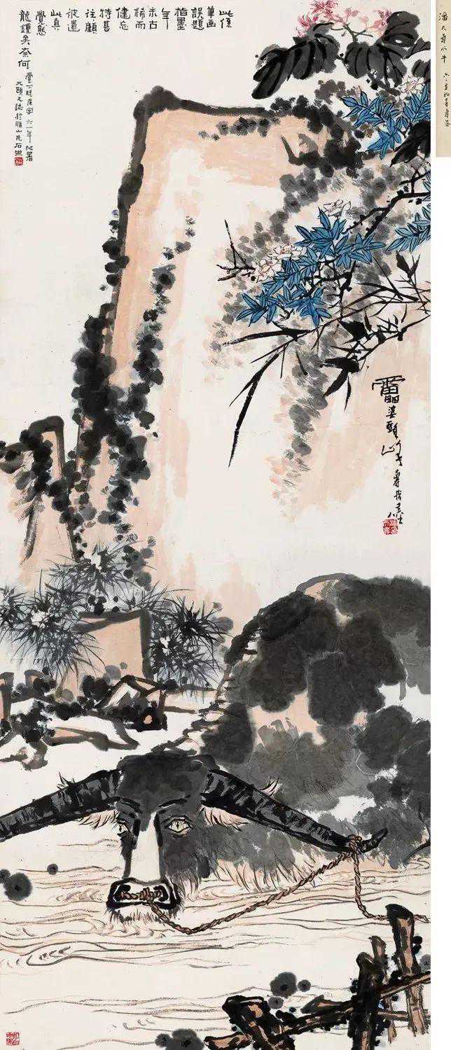 今年流行的“牛转乾坤”四字新年贺词,藉牛抒怀,谐音转义,牛气人性尽在其中。作者胡西林由此想到了潘天寿的《春塘水暖图》。《春塘水暖图》作于1961年,是潘天寿著名的山水花鸟画巨作,代表了潘天寿此类题材的最高水准,也是其存世仅四件的大幅绘牛作品之一。此图款题“辛丑腊梅开候”,也就是1961年春节前后,那正是前一甲子牛年之尾。今天,作者作此文补充在后一甲子牛年之首,首尾相衔,兆吉祥也。