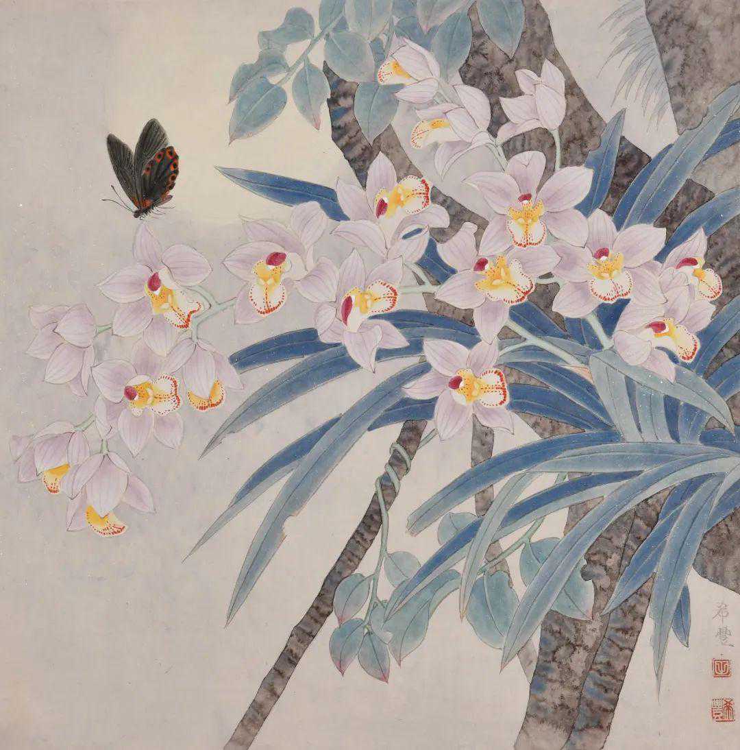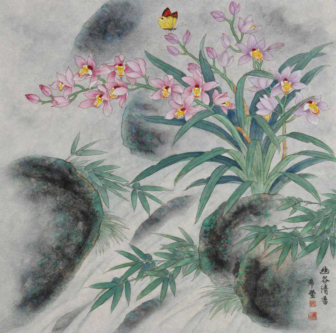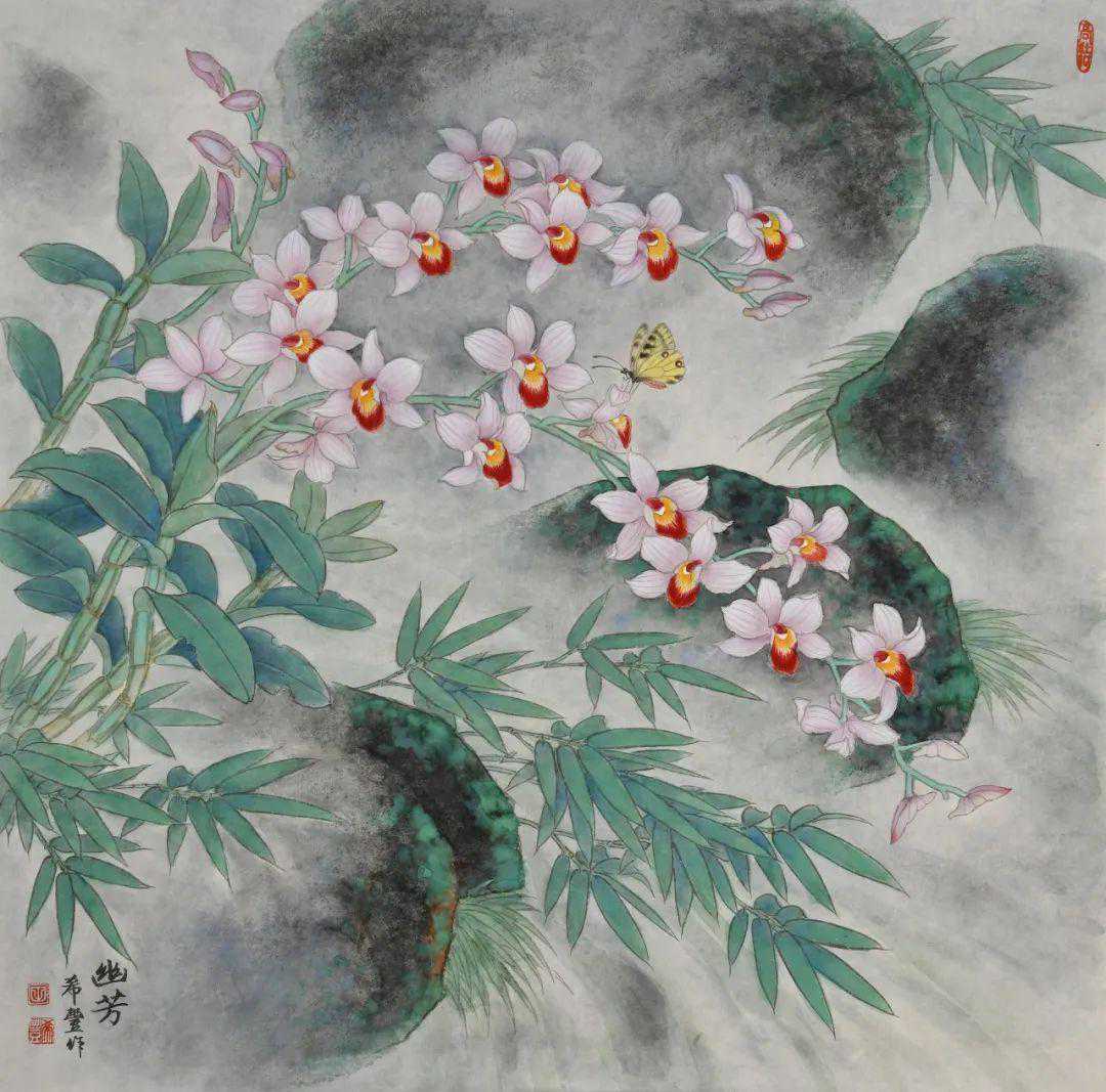 在创作中,我还尝试用各种自然景象作背景烘托兰花,以凸显其独特的韵味。如《竹林清幽》,用西双版纳佛肚竹来衬托兜兰的靓丽多姿;如《幽兰伴月》意境清幽,静静的竹林笼罩在朦胧的月色下,亦真亦幻,更显兰花的清丽迷人。近几年,我把山水画的云气用于兰花创作中,使画面更加空灵、静谧。如《雾中蝶舞》,画中姿态各异的蝴蝶兰,犹如在云雾中翩翩起舞的彩蝶,生机盎然。如《清香含露》,画中浮动的云雾,遮掩山石,突出了兰花和蝴蝶。