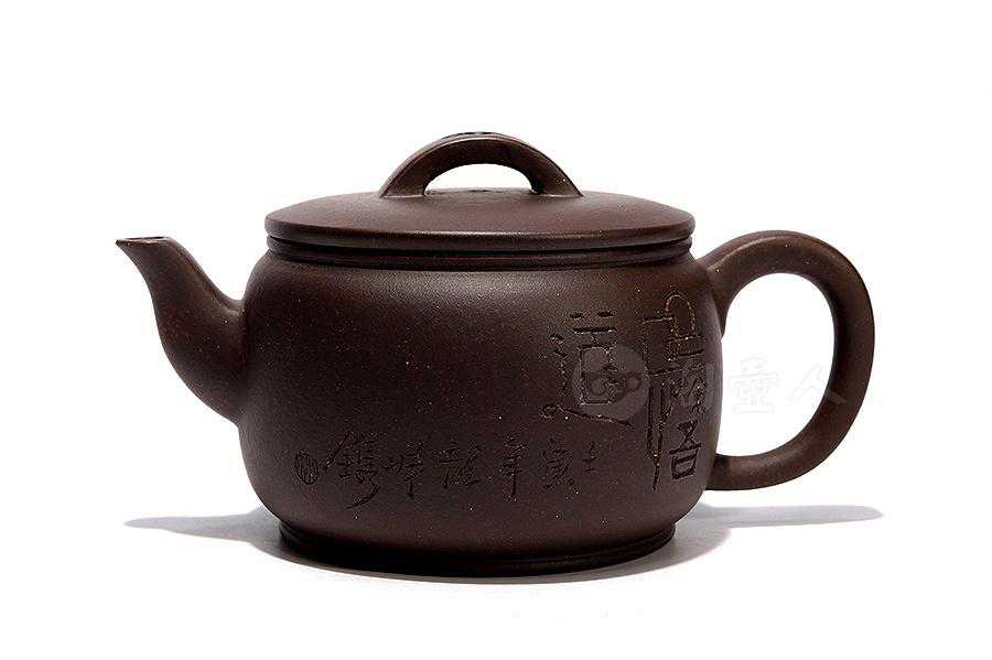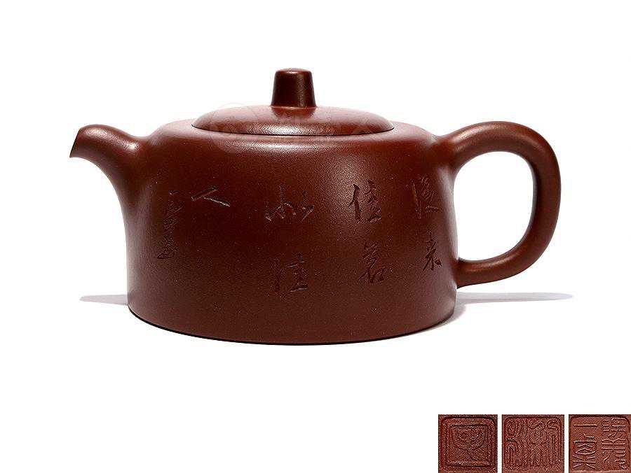 此壶集诗、书、铭于一体,正面腹部刻行书“待枪旗而采摘,对鼎历以吹嘘”,寥寥数笔,茶的色、香、味与紫砂器融为一体,极富意趣。