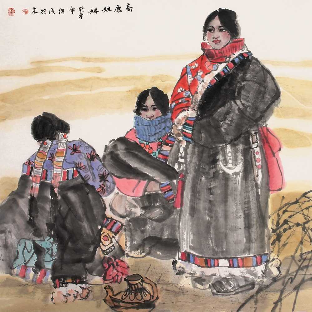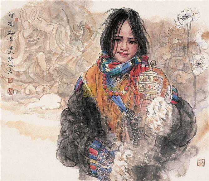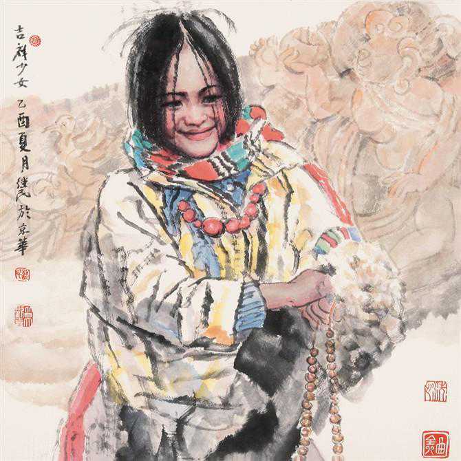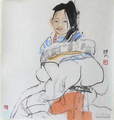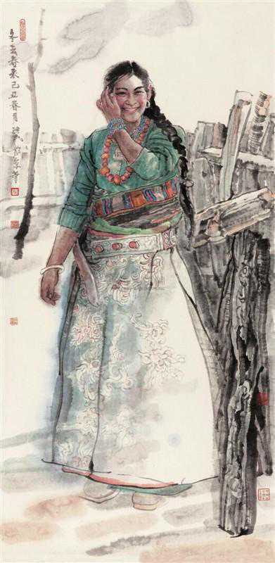 她站在山岗上,她那个味道表现的好极了,这个特定的情景和特定神采和她特意的服装,表现特别的好,也就是他对藏族人性格气质的把握也有着很好的感觉,他把这个感觉画出来了,他把消化了西洋艺术的素描因素,把造型,结构意识消化在自己的笔墨当中了,以笔法为主来造型形象的时候感到比较简练,也比较宁静,是他心目中的藏族女孩子的形象。
