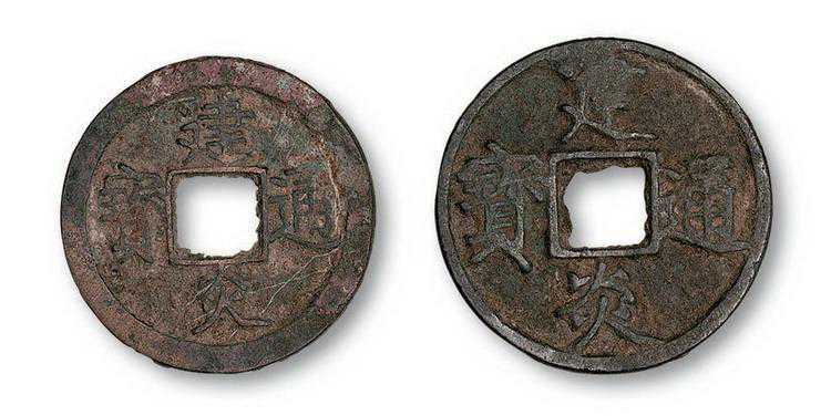 端平元宝,理宗端平元年铸,元宝唯见铜钱小平,面文楷书旋读,背穿上元,背文有记地,记值及记范等。通宝折五铜钱,重宝唯见当五铜钱,径3.4CM,面文楷书,直读光背,制作精美。.一般的价格为二三百元。