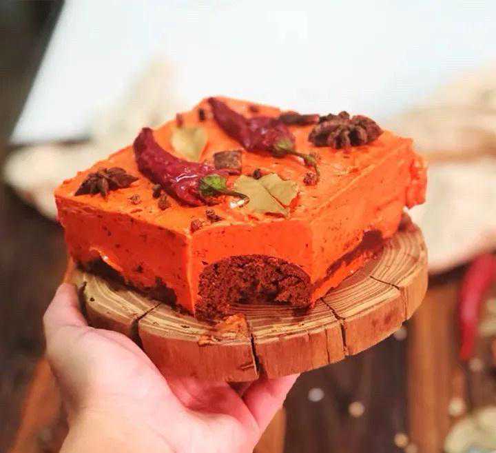 陈咪:火锅底料蛋糕,看着像是黑暗料理一样,火锅底料怎么可能是香甜可口的?其实底下是巧克力蛋糕,上面是慕斯,除了撒了真的辣椒花椒等配料做装饰,完全是一款香甜的蛋糕。蛋糕胚吃起来类似布朗尼,细腻绵密的蛋糕质感,让你吃一口就爱上这个感觉。