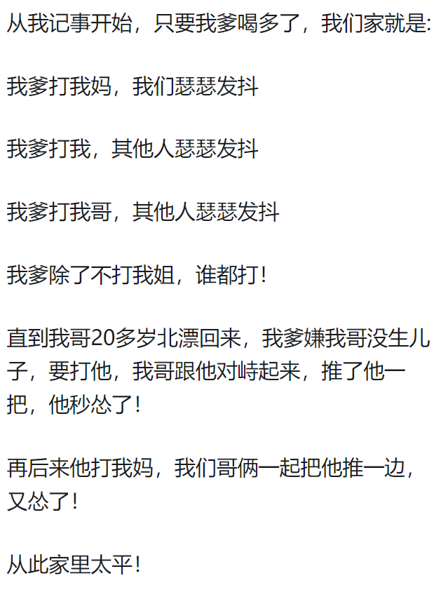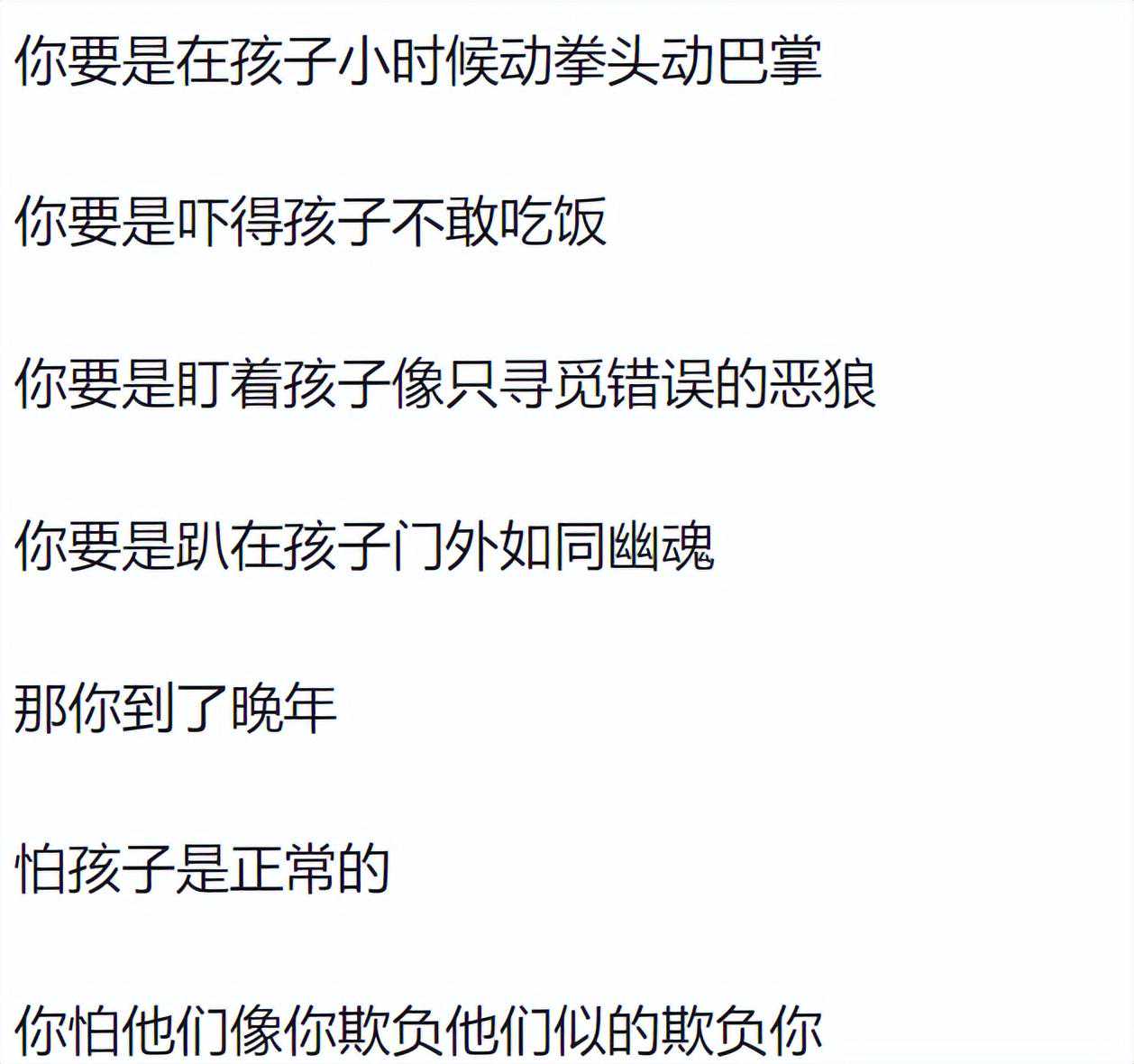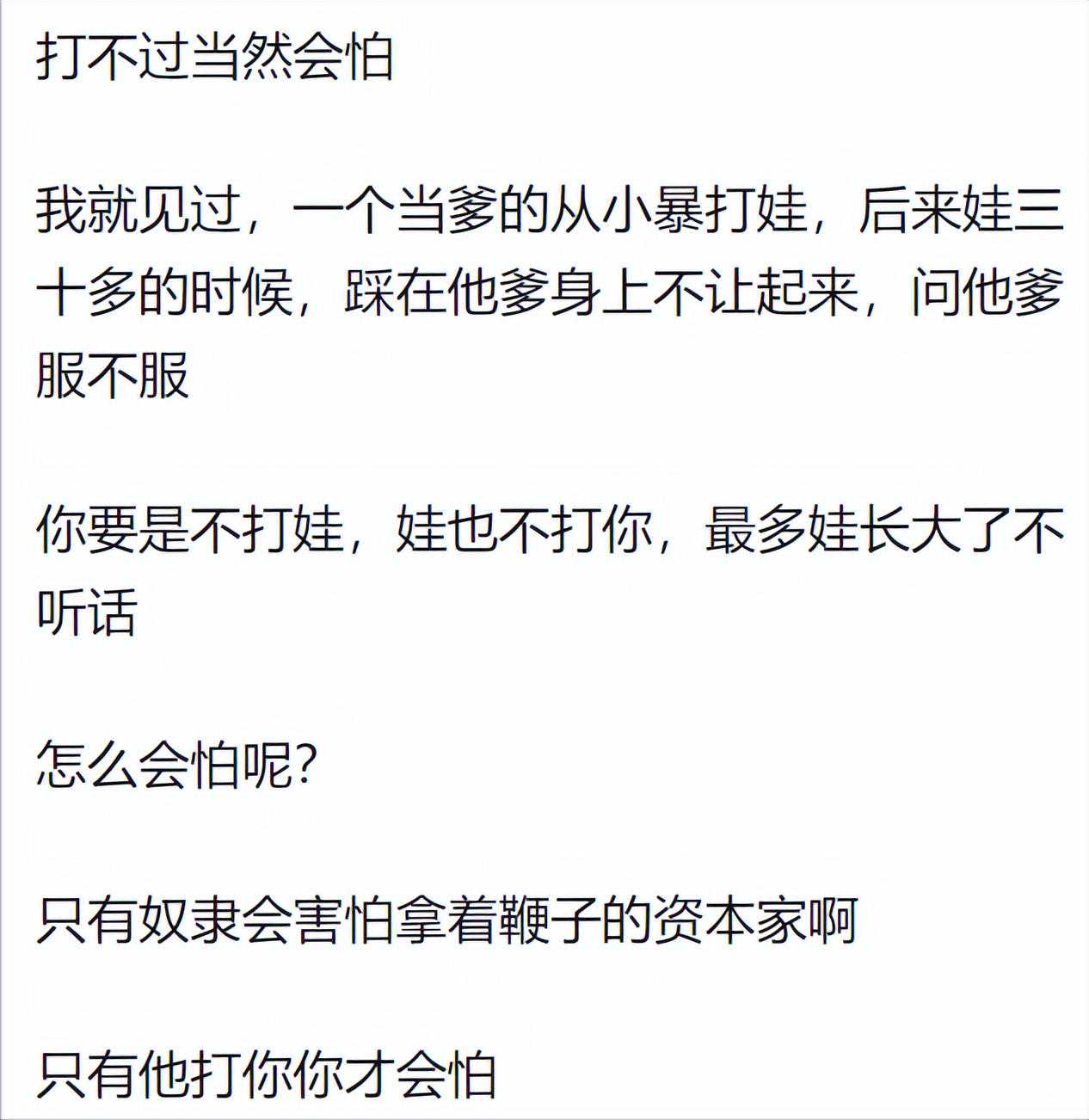 我最恶心的就是这种,在外唯唯诺诺,在家重拳出击的。我老看到有人总说养儿不一定防老,老了估计还不如生快叉烧。我就只能说,你怎么对孩子孩子就怎么对你。要么自己就别生,要么生了就好好带,不要总是说容易养个白眼狼,要看你怎么养的