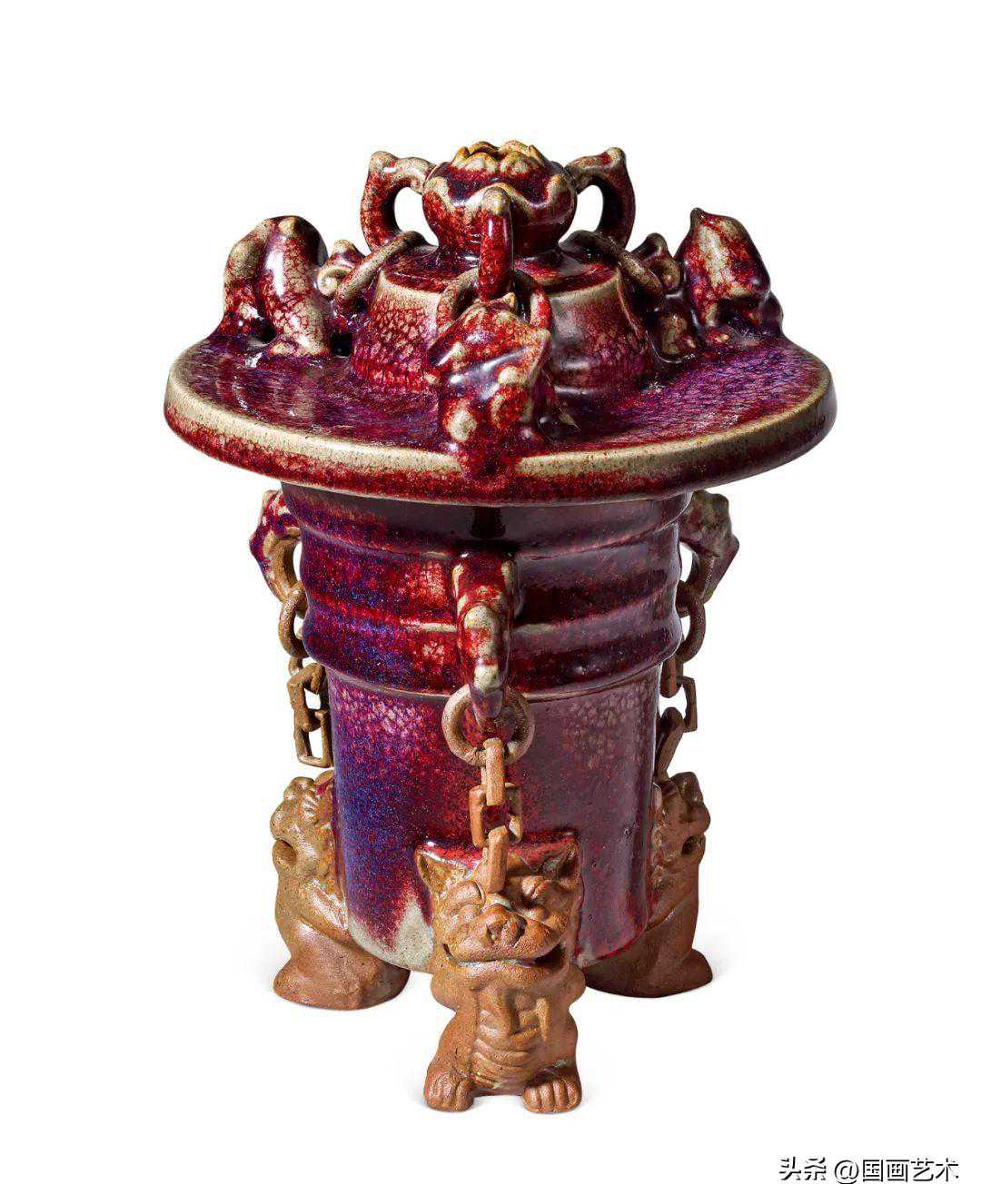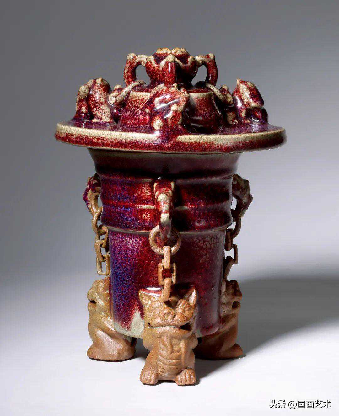 郑召钧窑《九兽链炉》,上世纪八十年代作。郑召钧窑创建于上世纪八十年代中期,当时钧瓷行业公有制企业在衰败,民营企业异军突起,发展迅速,一大批公有制企业的技术人员涌入民营企业,郑召钧窑就是这批钧瓷民营企业的佼佼者,他的钧瓷特点是:传袭了大量的公有制企业的技术、工艺、造型,具有钧官窑的血统;所有作品全部使用神垕镇当地的燃料“大红碳”“柳叶碳”煤烧制而成。郑召钧窑只生产了十年,于1996年停产,没有气烧和柴烧作品。郑召钧窑是钧瓷百花苑里的昙花,享有“不是官窑胜似官窑的美誉”。九兽链炉是郑召钧窑最具有代表性的作品,存世量极少,弥足珍贵。
