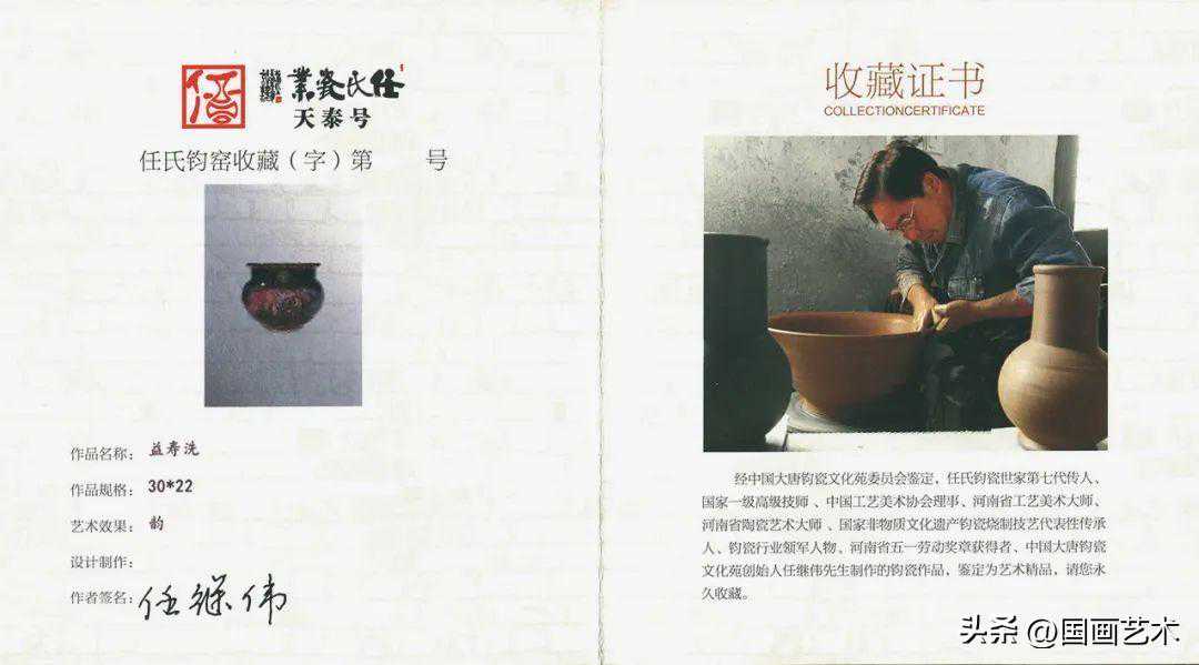 《益寿洗》为任继伟大师手拉坯作品,从造型到釉色呈现出了骄人的钧窑神韵。胎质细腻,做工精致,古朴厚重,典雅端庄,简洁大气,线条流畅,肩饰左右两虎抽象造型,王者气概油然而生。《益寿洗》的创新造型和绝代窑变,使之成为难得的现代创新佳作。