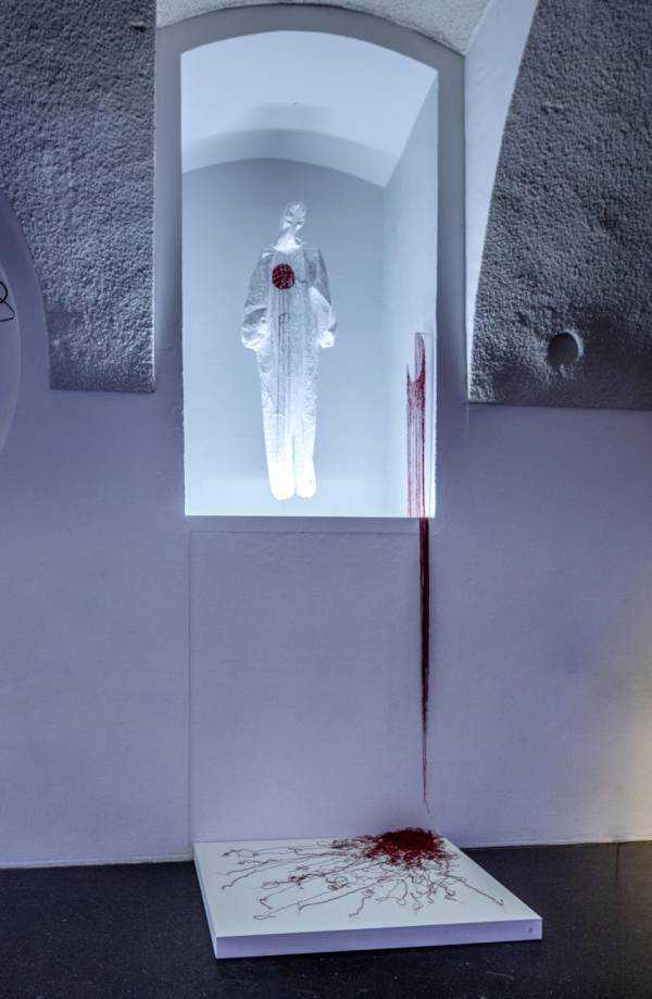 吉本直子的作品《堆芯熔融》:一件被吊起的白色防辐射连体服。胸前有一个红色旭日,寓意鲜血的红色颜料流淌一地。