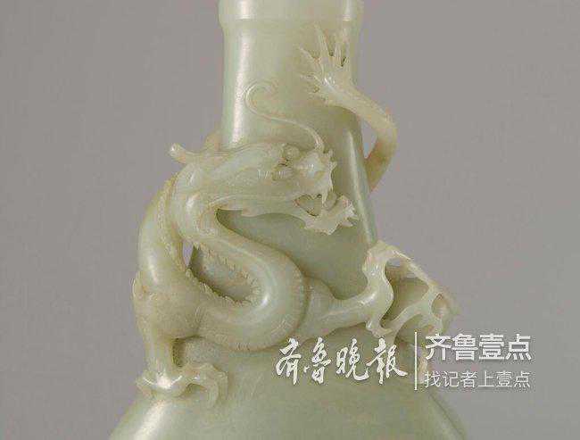 据烟台市博物馆工作人员介绍,创作这样大小的玉瓶是需要很大一块玉料的,当时玉匠深知此玉得之不易,所以特意在瓶颈上颇有寓意地琢饰出一幅骊龙护珠的生动造型。玉瓶被献于乾隆皇帝面前时,深受他的喜爱,所以题七绝诗一首,命宫廷玉工用楷书阴刻于瓶腹之上,诗曰:“捞取和阗盈尺姿,他山石错玉人为。一珠径寸骊龙护,守口如瓶意寓兹。”