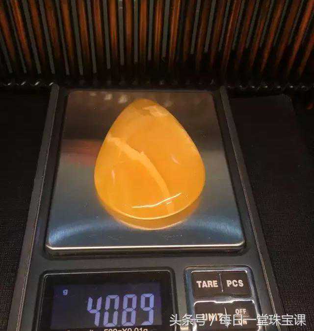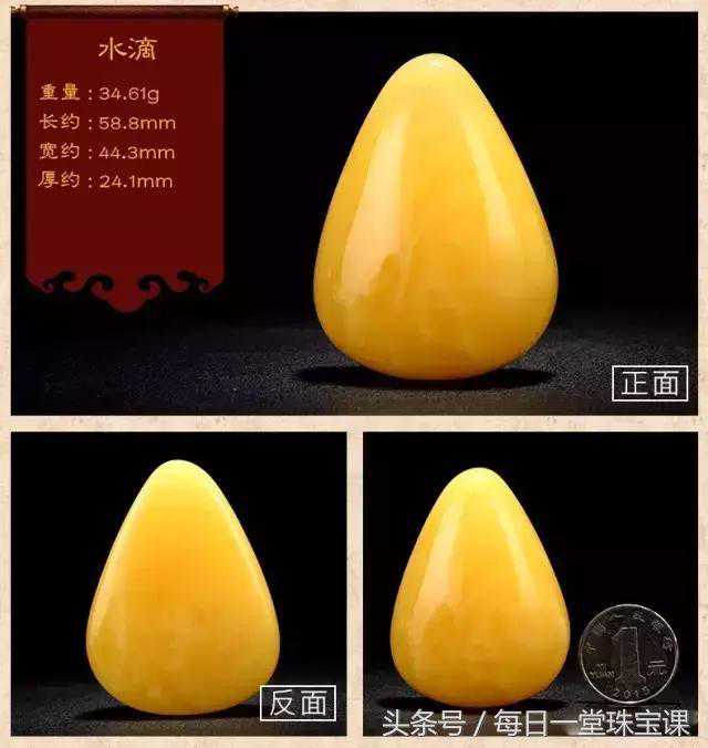 最完美的鸡油黄一般是蜜浓色均,而这一件近41克的超霸气满蜜水滴,呈鸡油黄的颜色,却又并非中规中矩,而是带有明显纹路和特点,因此价格方面会略有打折,然而正因为如此,对于那些喜欢蜜蜡天然纹路的朋友来说,绝对具有超高的性价比。