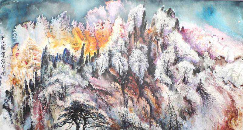 30年来,他以自然为师,废画三万,独创出表现雾凇雪景的“三泼留白法”“隐笔留白法”“雪山蛇皮皴”等技法,营造了一个霜凝雪挂皆雾凇的冰雪世界,其意境之美,着实令人惊艳!