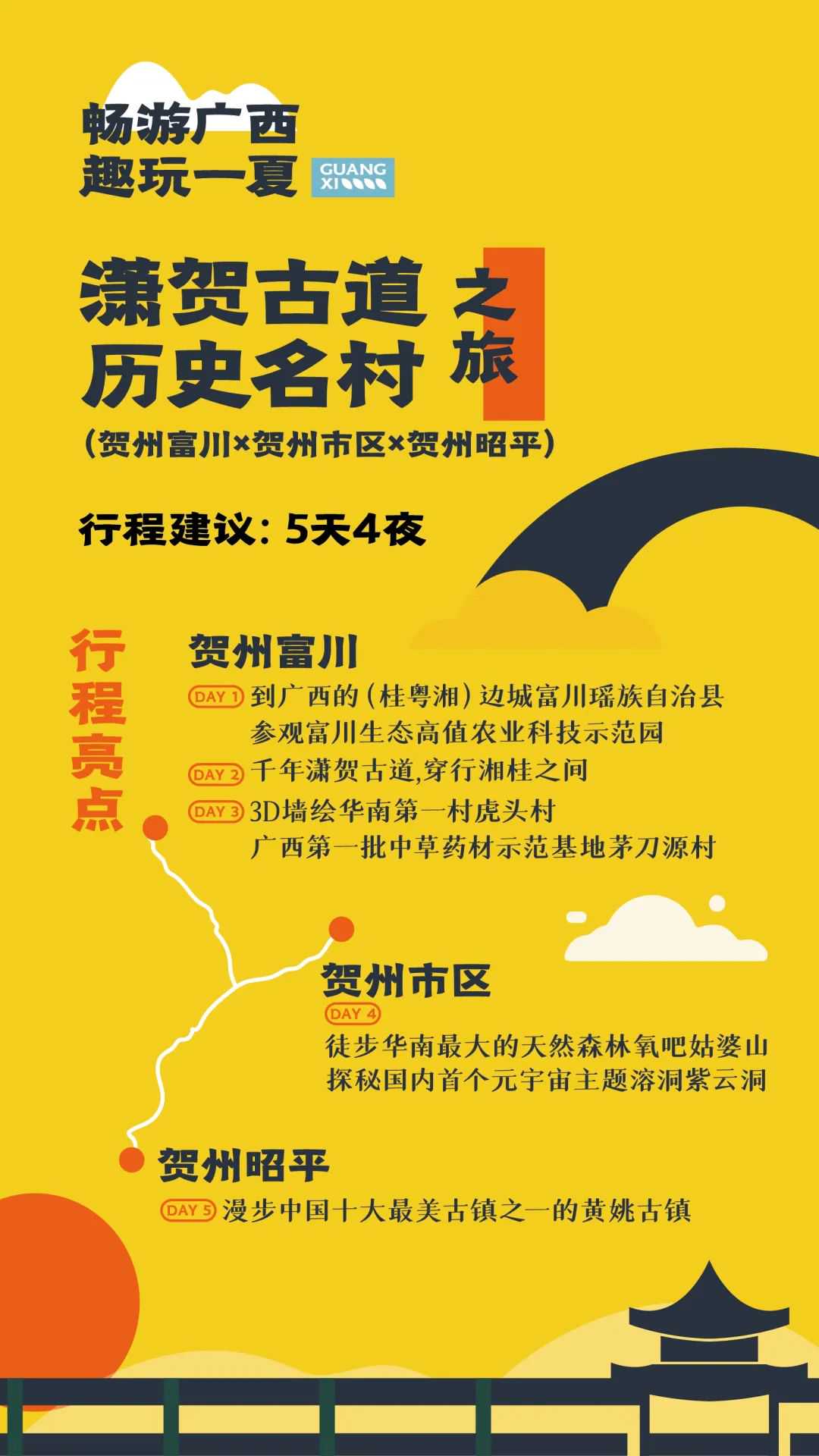 交通方式与时长:建议高铁抵达贺州后租车自驾。贺州—昭平(50m)、昭平—富川(1h)、富川—贺州(1.5h)