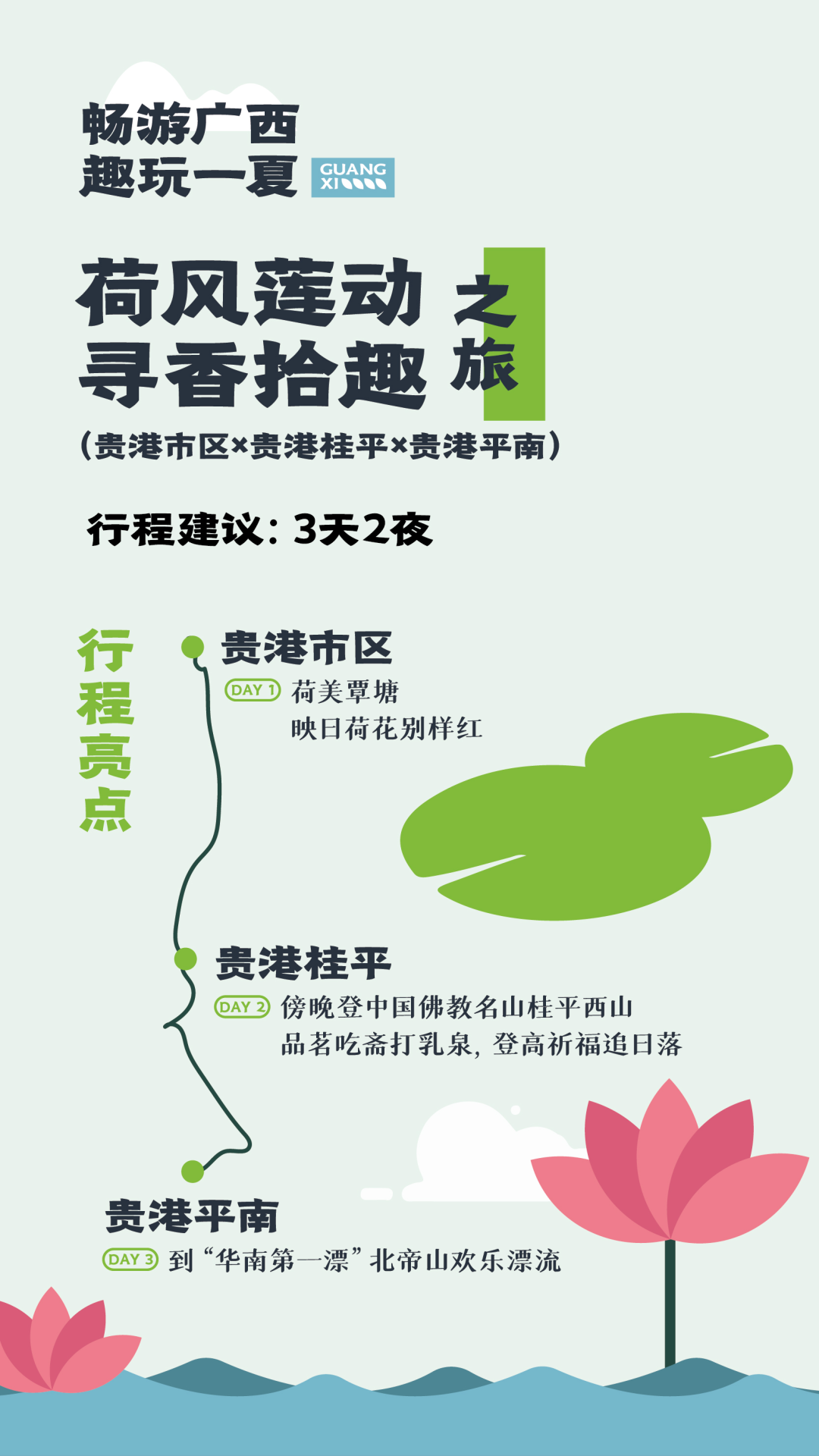 交通方式与时长:高铁抵达南宁租车自驾。贵港—桂平(1h)、桂平—平南(1.5h)、平南—贵港(1.5h)