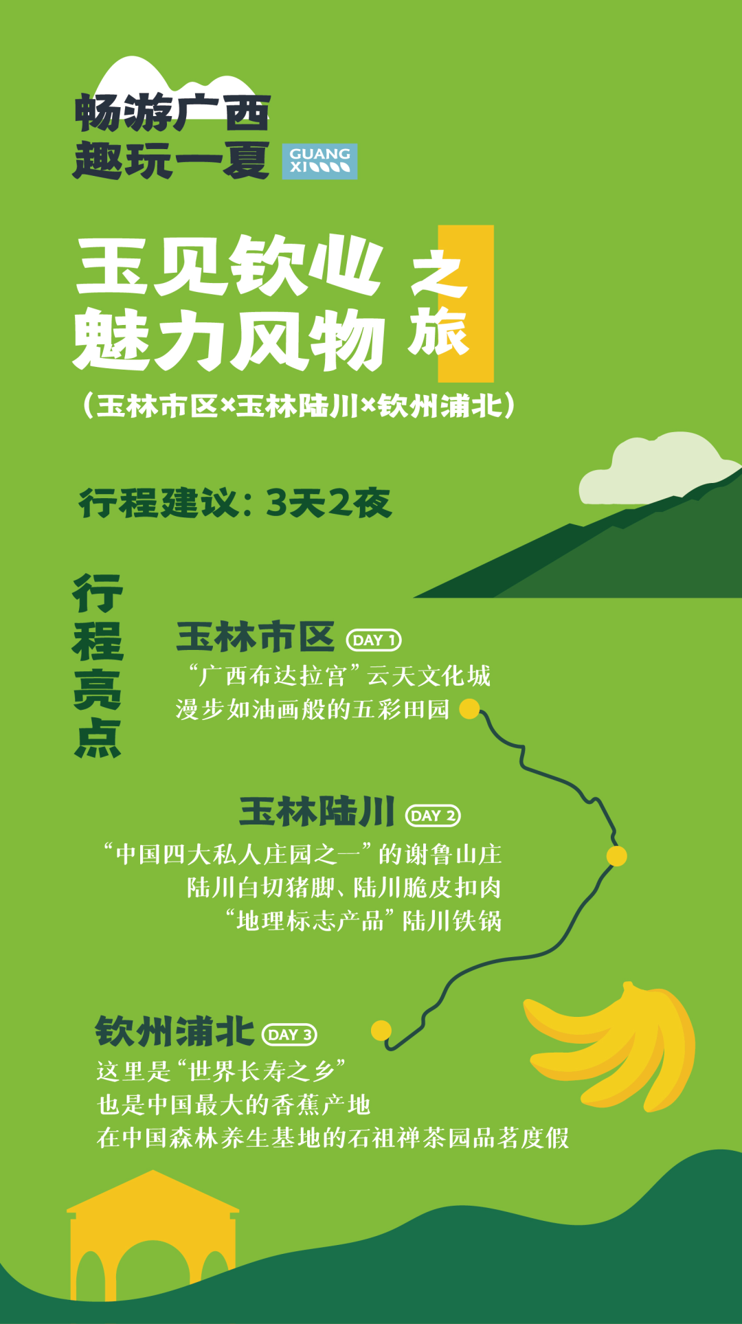 交通方式与时长:建议乘火车抵达玉林租车自驾。玉林—陆川(1h)、陆川—浦北(2h)、浦北—玉林(2h)