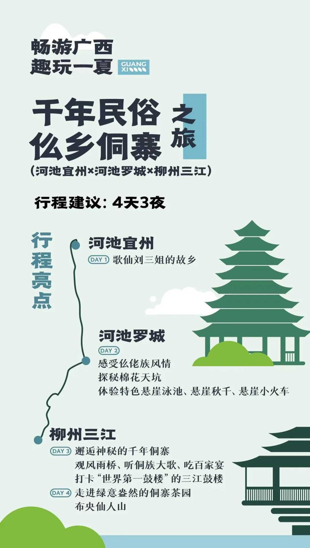 交通方式与时长:建议高铁抵达河池后租车自驾。宜州—罗城(1h)、罗城—三江(2.5h)、三江—河池(3h)