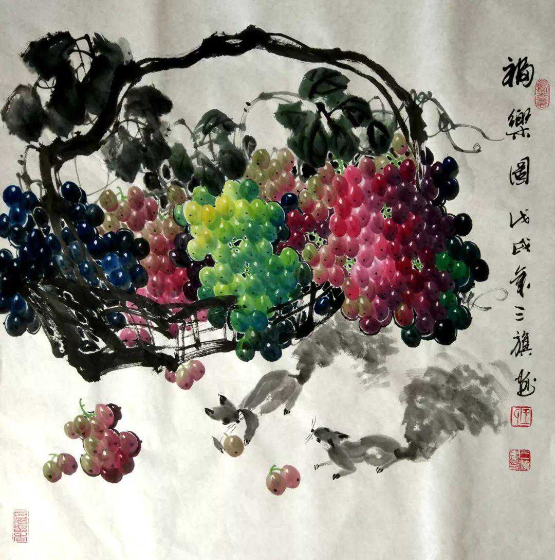 王三旗是湖北人,湖北人聪明,表现在绘画艺术上,亦是如此。王三旗1961年生于湖北谷城县,自幼对中国的传统绘画情有独钟,是我国优秀的中青年画家之一。早年,他潜心钻研葡萄画技法,始终坚持学、悟、练相结合,秉承了中国古今杰出艺术家的绘画理论和技法,充分表现出了“三旗葡萄”的情、趣、韵的效果。他的葡萄呈现给观者的极具透视效果的串串玉珠,可谓绿紫相间、珠圆玉润。