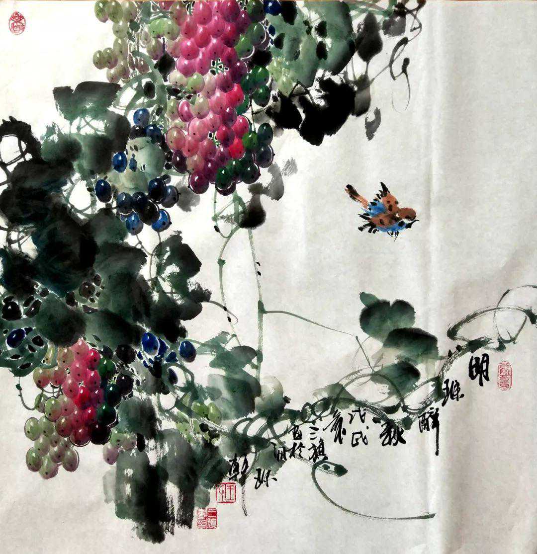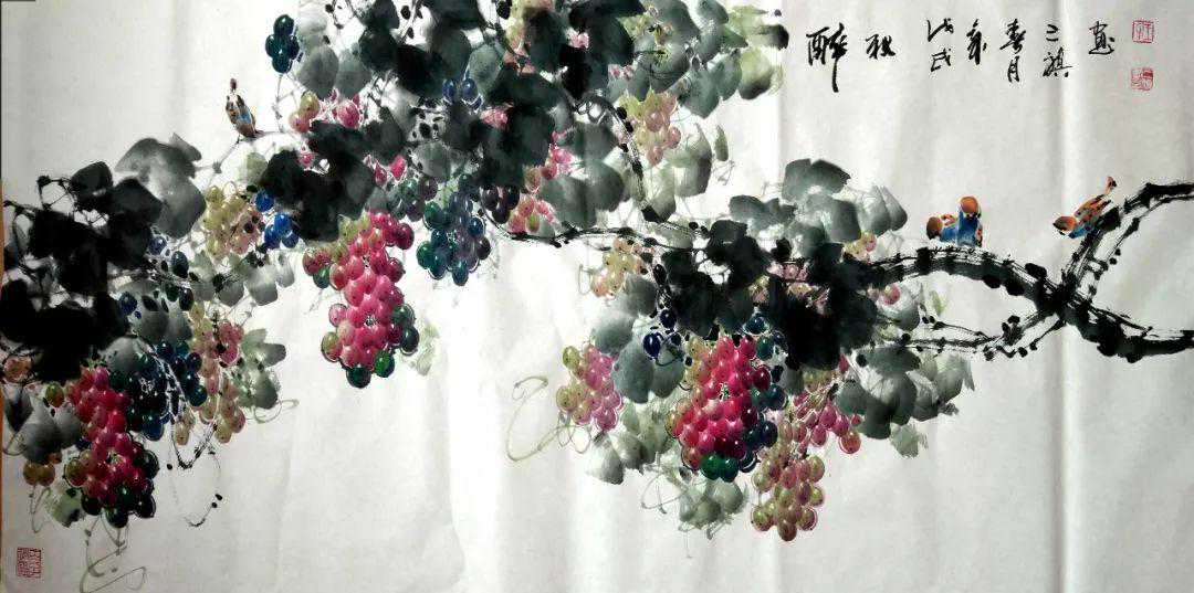 功夫在画外也是他格外重视的艺术素养之一。王三旗工作之余,经常游历于文学、历史、诗词的知识海洋,汲取养分,获取动力。观王三旗葡萄,构图成熟,落笔果断。其浓淡相映,干湿相济,笔下葡萄紫中泛绿、绿中透红,恰似串串明珠,给观者以新鲜欲滴之感。其构图或藏或露、互相参差、交错有序、疏密有致,实可谓相得益彰、笔墨丰润、珠粒饱满,实如临自然之境。