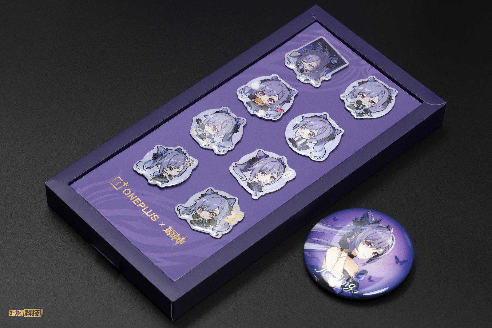 往下看看其他的配件,首先看到的就是一套一加与原神联合定制的Q版刻晴纪念金属徽章,这相信就是原神玩家们最期待的一个周边了。整套一共有八个徽章,每一个徽章都是刻晴的定制可爱表情,非常具有收藏价值。