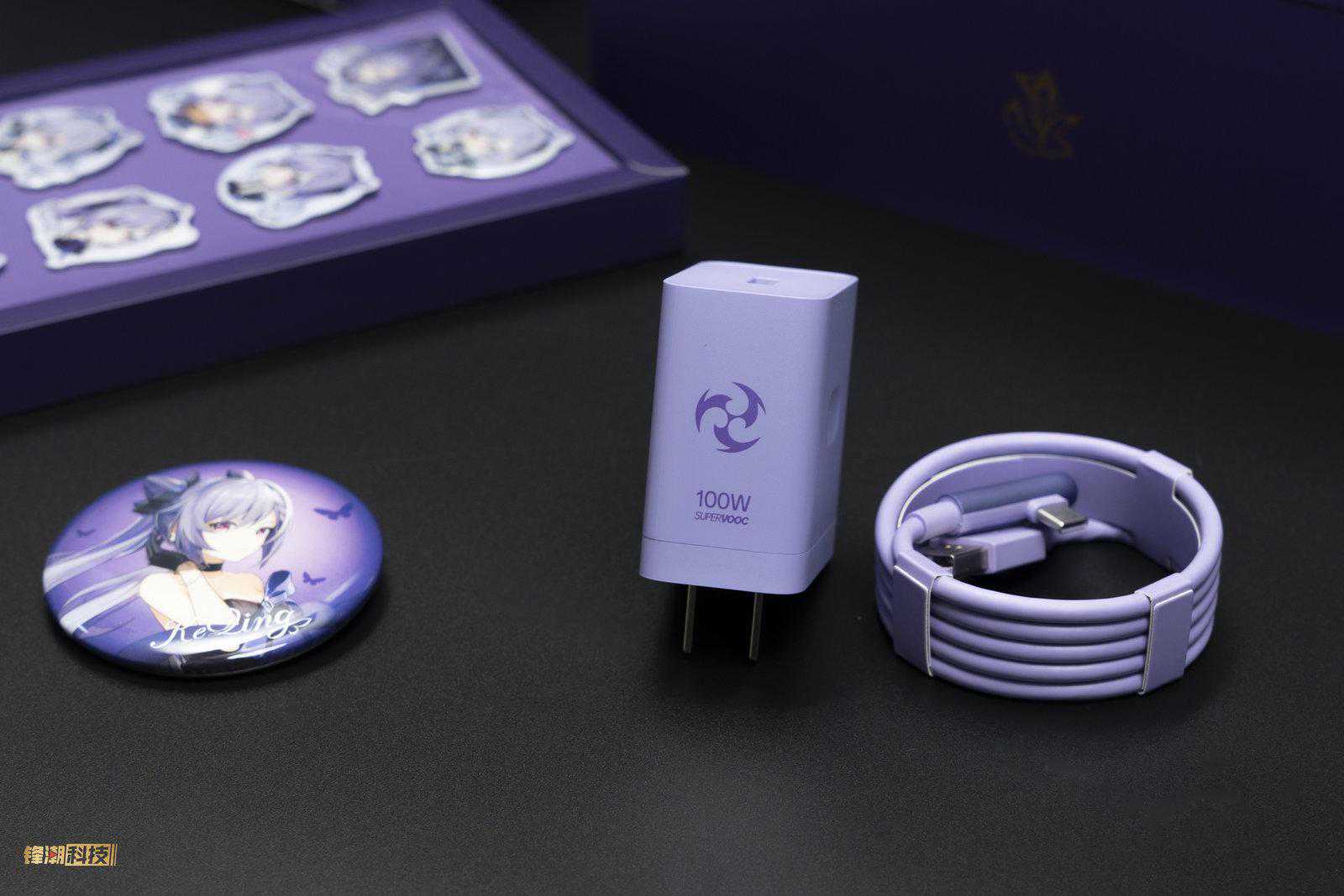 充电套装同样是紫色的元素,充电器上有刻晴的雷元素标志以及刻晴的名字LOGO,快充数据线则采用独特的T型弯头设计,方便在玩游戏时横屏握持。但需要注意的是,虽然数据线做了T型设计,但为了安全起见,还是建议不要边充电边玩手机。