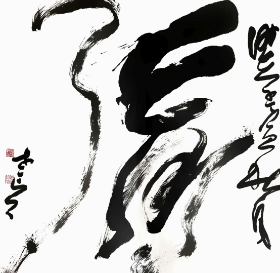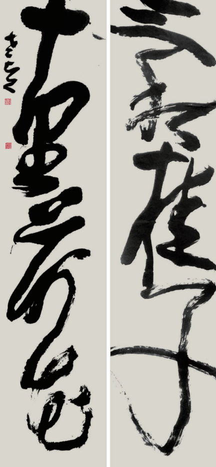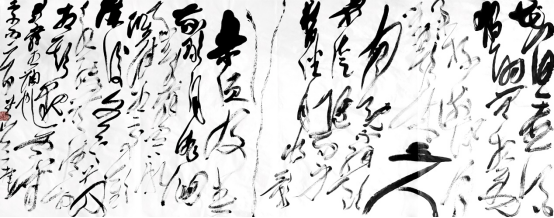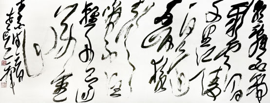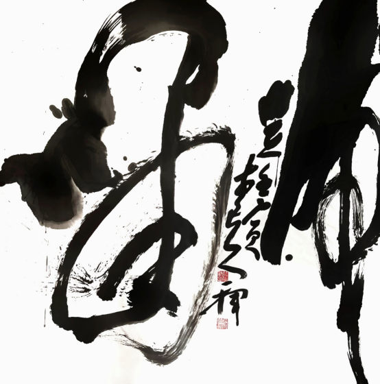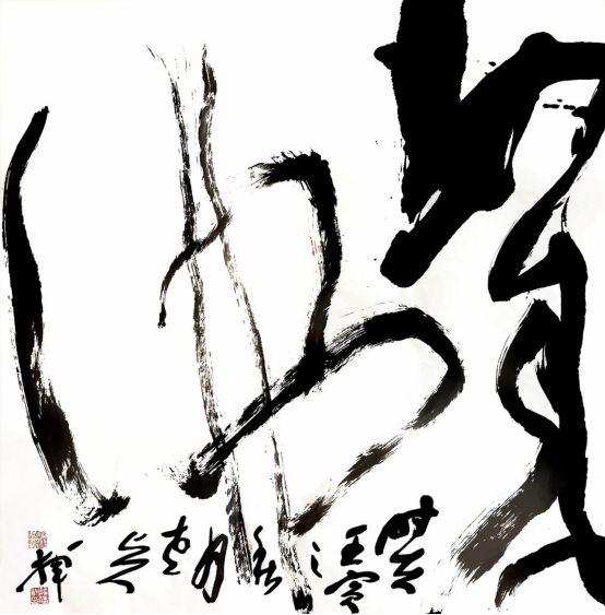 传贤的书法,还体现出王铎书法那种结体险劲。险指奇而言,劲以力而喻。险,固然与劲分不开。险的本身就蕴力量于其中,流畅飞动的狂草尤重笔力,方能险中有夷。传贤先生在他的书法作品中,为了追求险劲,往往偏旁移位,从而左右或高或低,或正或斜,有时又以黑白浓淡易位来渲染气势,使整个作品体势遒劲,笔力险峻,纵横取势,变化惊人。