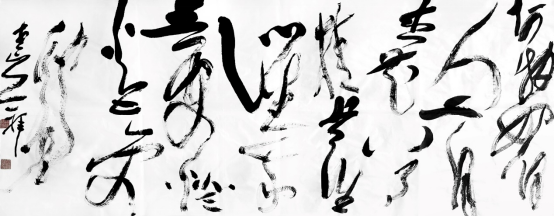 先生的书法,是以心作书,平时他练习之多,而创作之少。别人求书,他也不随便赠与,不是舍不得,而是“兴”未到来。古人云:“书,心之画也。”传贤作书,落笔之前总要做到心中有数,然后大胆挥洒,若是到了“兴来小豁胸襟气”之际,他必然也会进入“忽然绝叫两三行,满壁纵横千万字”的创作状态。所谓“兴”,就是创作灵感,我猜想,寡言少语的潘传贤,可能不是生来就寡言少语,而是他要把节约下来的语言,储蓄的豪气灵动,在“兴来小豁胸襟气”的“小豁”之际,以狂草书法的形式泼在纸上。这种性格,许是个人的造化,许是上帝的给予。传贤先生的书法,有怀素草书豪放不羁的特色。草书贵在无拘束。传贤的书法,回环缭绕相钩连,千变万化,这种由情感驾驭的书写形式,从整体上讲突破了过去的章草和二王草书不相钩连的格局,使草书更加丰富多彩,变化多端。他的狂草大小,长短以及布局对比鲜明,突破了以往整齐、均匀,呆板的格局,使草书更加错落有致,更加富有自然主义和浪漫主义情趣。